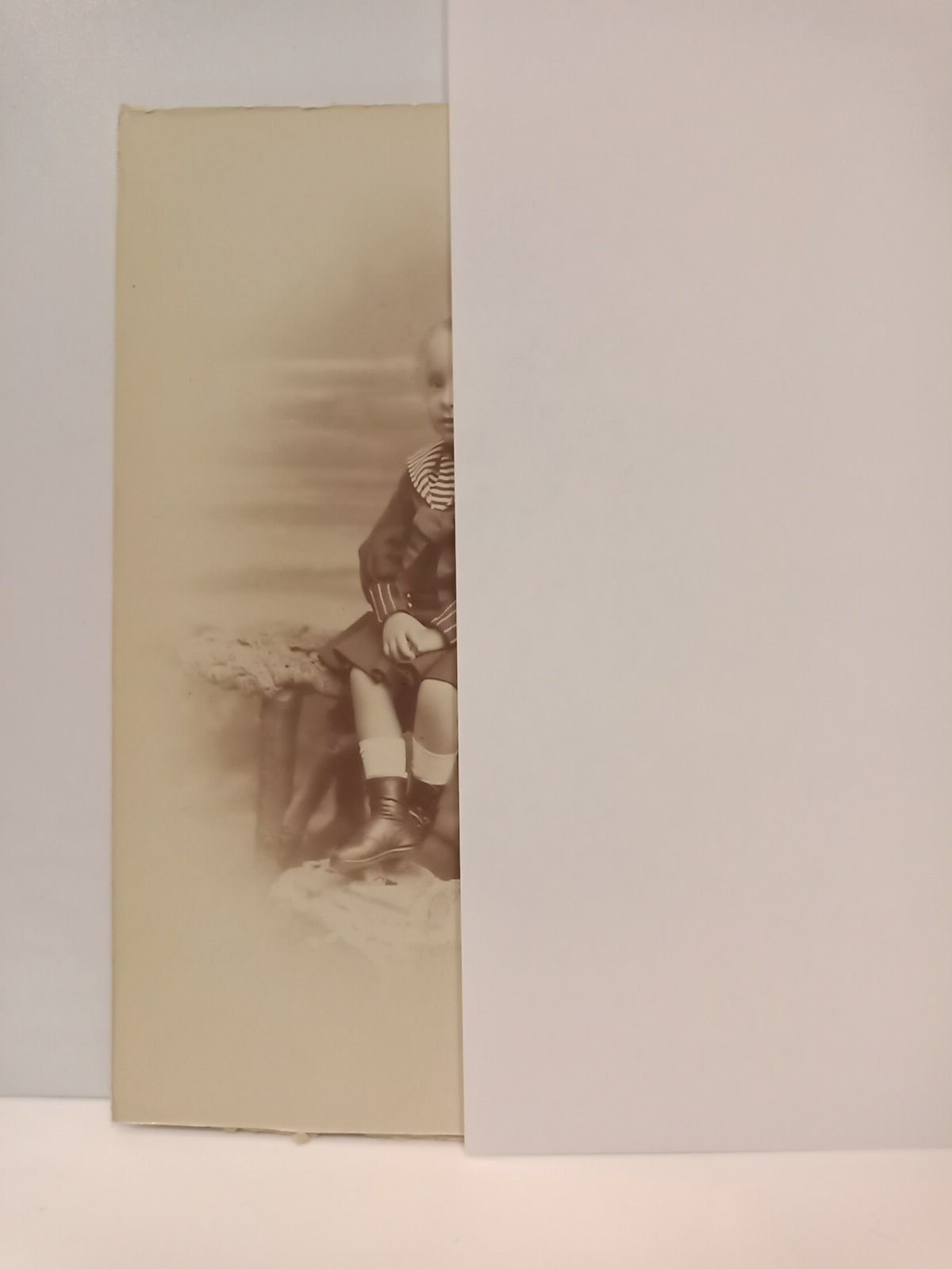 Madrid: Fernando Debás, [ca. 1888].- 16 x 10,6 cm.; color sepia en semi-brillo.- El pequeño príncipe aparece sentado en un banco posando muy formal con las manos cogidas y en traje de marinero. Los márgenes del soporte han sido recortados posiblemente para introducir el retrato en algún marco determinado. En el verso aparece el escudo y anagrama del estudio fotográfico madrileño.* POLÍTICA ESPAÑOLA DESDE 1833 A 1936