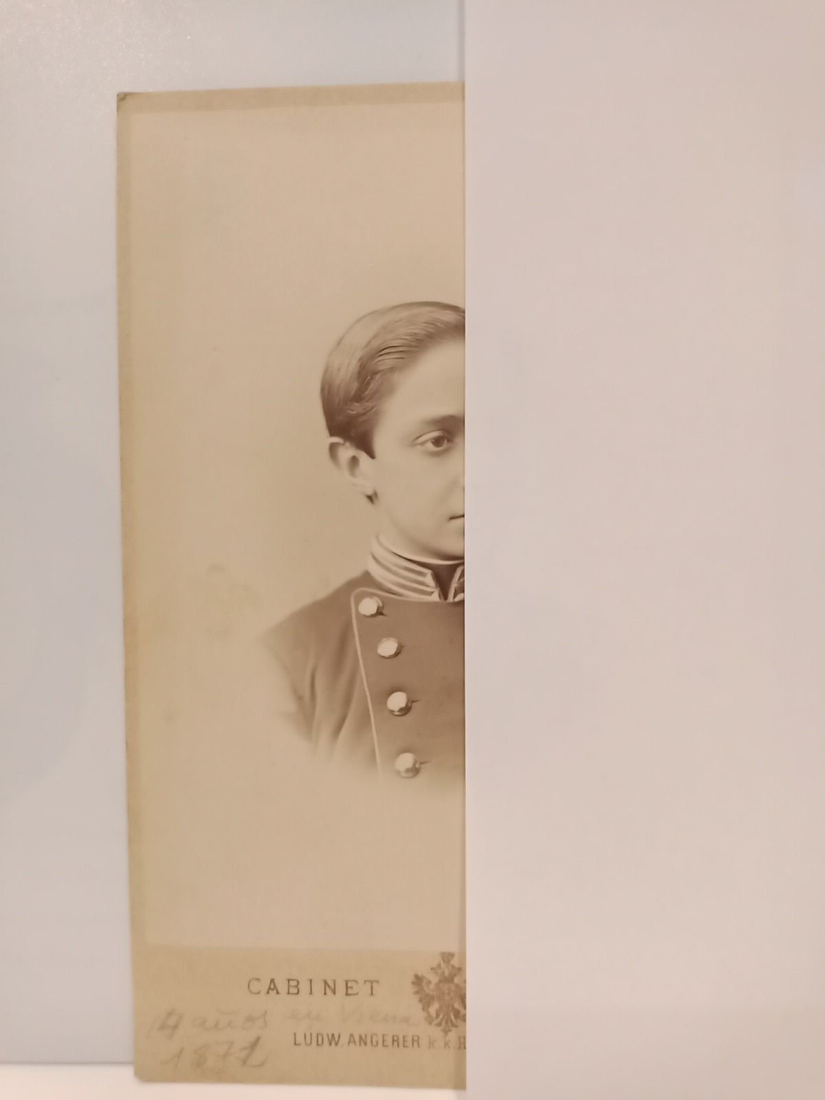 Wien: Ludw. Angerer, [ca 1871].- 13,8 x 10,2 cm. en soporte de 16,5 x 10,8 cm.; color sepia en mate.- Aparece el joven rey, en el que su madre, la Reina Isabel II, había abdicado en el exilio de París en 1870 cuando él tenía tan sólo 13 años, a la edad probable de 14 años en que fue enviado a Viena. Lleva uniforme y muestra un rostro sereno pero con una expresión apagada y entristecida, en la que se refleja su difícil situación personal siendo todavía un adolescente. Al pie del soporte nombre y datos del fotógrafo y en el verso el escudo y slogan publicitario del estudio fotográfico.* POLÍTICA ESPAÑOLA DESDE 1833 A 1936