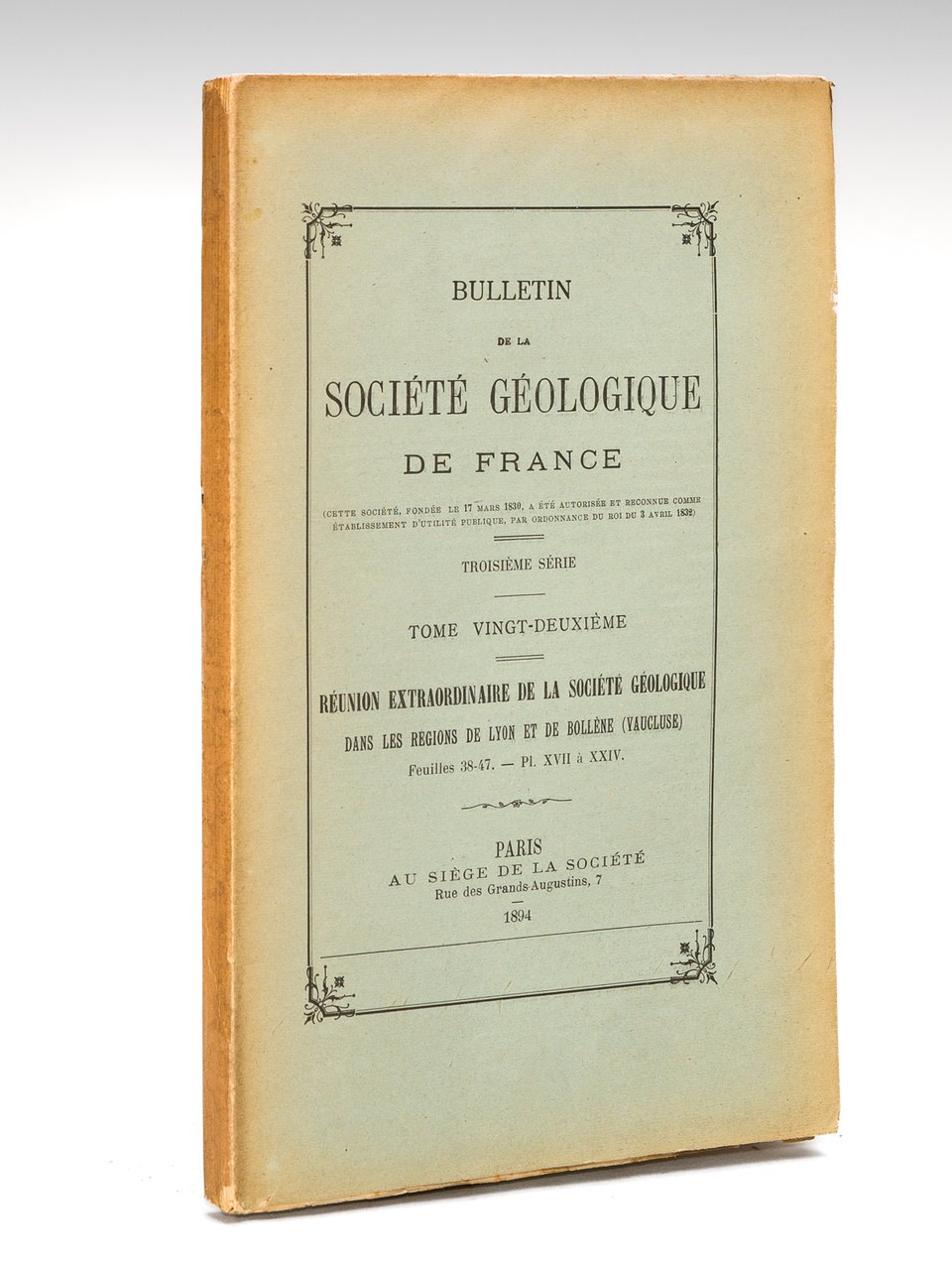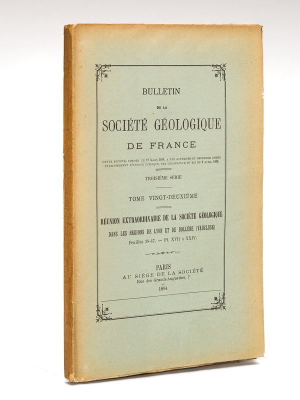 1 vol. in-8 br., Au Siège de la Société géologique de France, Paris, 1894, pp. 594-724 avec 8 planches hors texte. Rappel du titre complet : Réunion extraordinaire de la Société Géologique dans les régions de Lyon et de Bollène (Vaucluse). Bulletin de la Société Géologique de France. Troisième Série. Tome Vingt-Deuxième Bon état pour ce compte-rendu de la réunion extraordinaire dans les régions de Lyon et de Bollène. On notera la présence de 8 planches hors texte. Bon exemplaire, non coupé.