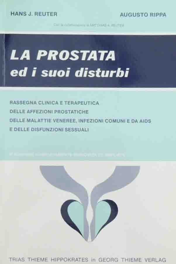 Hans J. Reuter, Augusto Rippa, con la collaborazione di Walter Epple e Matthias A. Reuter, La prostata ed i suoi disturbi. Rassegna clinica e terapeutica delle affezioni prostatiche, delle malattie veneree, infezioni comuni e da Aids e delle disfunzioni sessuali, Squibb, Roma s.d. (1989?), pp. 175, ill. b.n., cm 24, br. ed. Edizione fuori commercio omaggio per medici da parte di Squibb S.p.A. Alla prima di coprtina: sesta ed. completamente rinnovata ed ampliata. Traduzione ed ampliamento della seconda ed. italiana a cura di Augusto Rippa. Traduzione ed adattamento della prima ed. italiana a cura di Ulrico Jacobellis. Una ventina di pagine con leggere sottolineature a biro, per il resto buona copia.