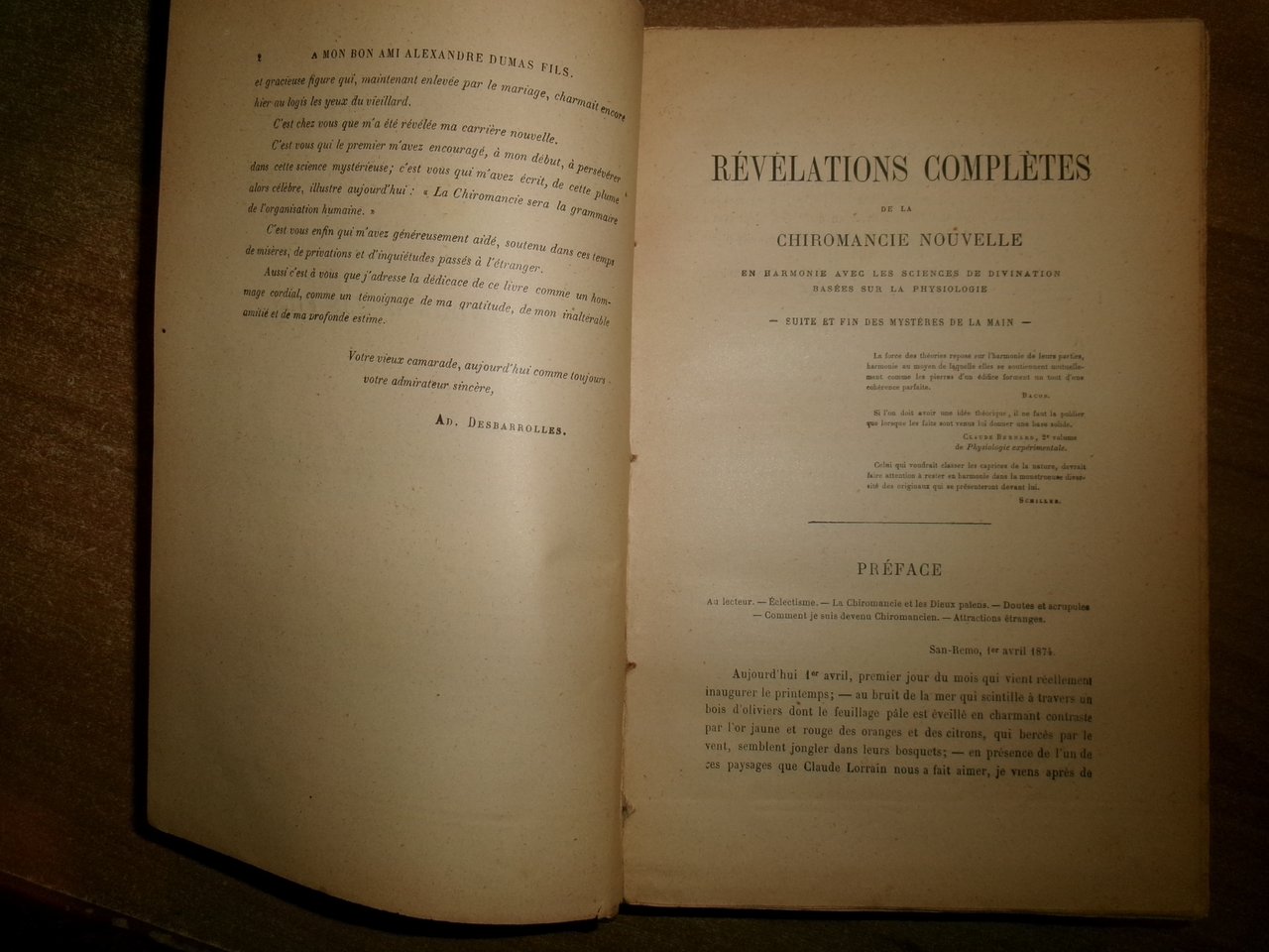 AD. DESBARROLLES. Paris, Vigot Frères, Editeurs, 1927. Révélations complètes. Chiromancie, Phrénologie, Graphologie, Etudes Physiologiques, Révélation du passé, Connaissance de l' Avenir. In-8°, m. tela, con titolo in oro al dorso. 1050 pp. con 500 figures explicatives. Ottimo esemplare ricercato. Uff. scat. 9
