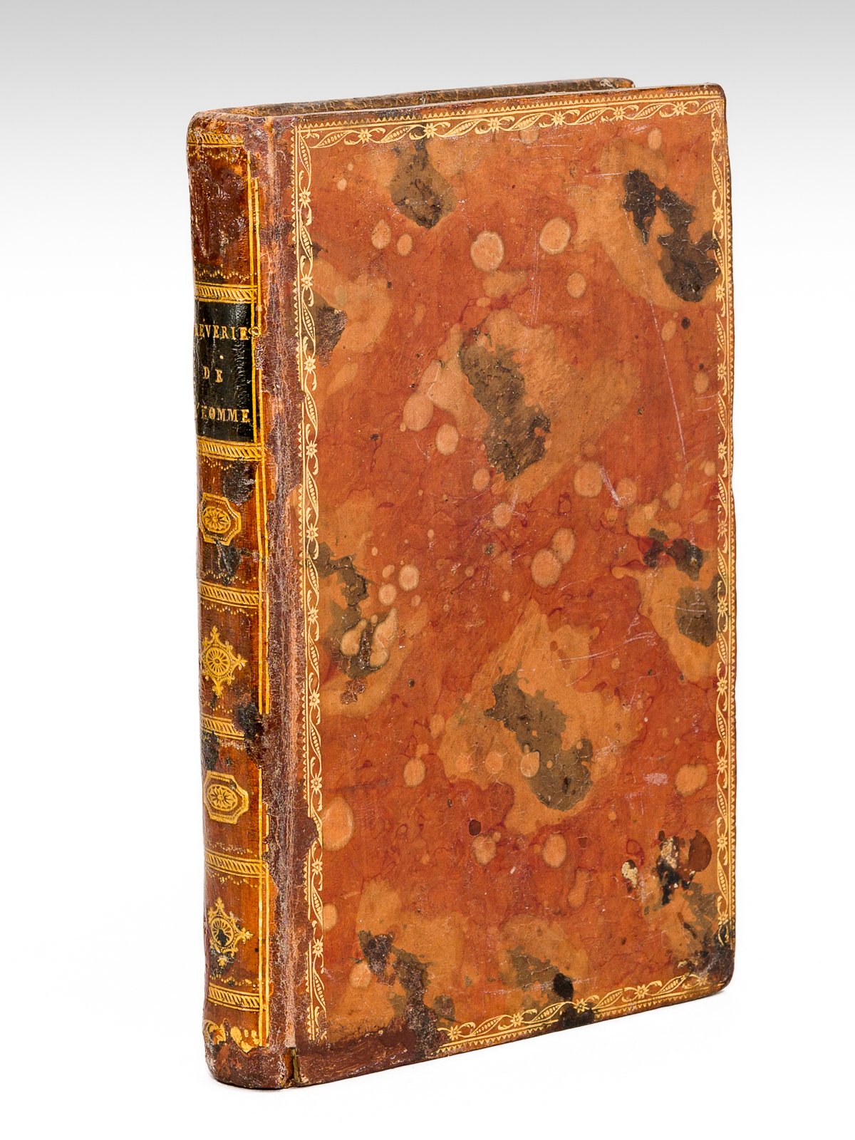 1 vol. in-8 reliure plein veau porphyre de l'époque, dos lisse orné, dentelle dorée d'encadrement en plats, filet doré en coupes, Chez J.-Ch. Laveaux et Compagnie, De la Tynna, Moutardier, Cérioux, A Paris, An VIII [ 1800 ], 2 ff., 340 pp. Rare exemplaire de la première édition complète, l'édition originale de l'An VI n'étant qu'un fragment de 47 pages recueillant seulement 2 "Rêveries" sur les 17 de la présente édition. Pris de passion dès son jeune âge pour Rousseau, Etienne Pivert de Sénancour (1770-1846) s'enfuit en août 1789 pour éviter le séminaire. Après un mariage malheureux en Suisse, il revient à Paris en 1795 où il publie "Aldomen, ou le Bonheur dans l'Obscurité". Il publie ensuite le présent ouvrage, déjà expression du premier romantisme, écrit plein de mélancolie, de contemplation de la nature et de volonté de changement social. Son plus célèbre roman, Oberman, paraîtra en 1804 et sera célébré par les plus grands écrivains : Sainte-Beuve, George Sand, Nodier ou Balzac, pour n'en citer que quelques-uns. Rare exemplaire en pleine reliure du temps (reliure frottée avec petits mq. en dos et plats, reliure vernissée, notice de catalogue contrecollée en garde, bon état par ailleurs, ex-libris en garde) de ces rêveries de l'un des tous premiers romantiques français. Clouzot, 147 ; Carteret, II, 335