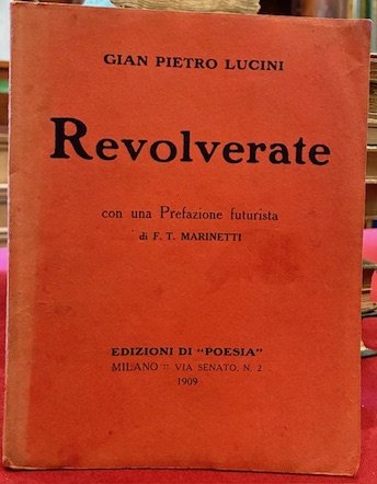 8vo (cm. 19,2), 360 pp. Brossura editoriale (ds. leggermente sbiadito). Esemplare in eccellente stato di conservazione. Edizione originale. Testo importante e rappresentativo dei primi vagiti del movimento futurista. Il libro avrebbe dovuto, nelle intenzioni dell'autore, intitolarsi Canzoni amare, Revolverate nasce da un accordo tra Marinetti e Lucini. La prefazione illustra il valore rivoluzionario del libro, antiborghese e antimilitarista.