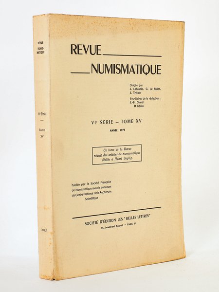 1 vol. in-8 br., Revue de Numismatique - Société Française de Numismatique, Société d'Edition "Les Belles Lettres", Paris, 1973, 338 pp.+ XXIX pl. noir et blanc. Au sommaire notamment : monnaies grecques trouvées en Afghanistan ; les monétaires et un décret héllenistique de Sestos ; Sur quelques monnaies de Tyr ; ccollection de monnaies du musée national de Beyrouth ; la divinisation de César dans la politique d'Antoine et d'Octavien, entre 44 et 40 avant J.-C. ; Valérien jeune était-il myste d'Isis ? une des premières vérifications de la loi de Gresham : la circulation monétaire dans l'État pontifical vers 1200 ; trésor de monnaies indiennes et un indo-grecques d'Al-Khanoun ; le trésor de Kertch ; le trésor de Lavilledieu (Ardèche) ; la trouvaille de Ribes (Ardèche). Etat très satisfaisant (couv. lég. frottée, très bon état intérieur) pour ce numéro consacré à Henri Arnold Seyrig (1895-1973), archéologue français qui fut directeur général des Antiquités de Syrie et du Liban dans les années 30, et créa l'Institut français d'archéologie du Proche-Orient.