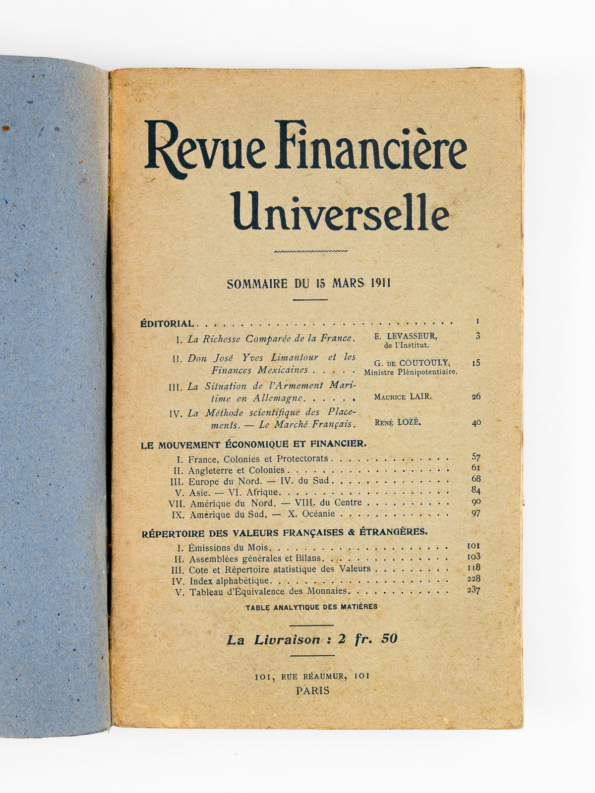 1 vol. in-8 br. sous surcouverture en papier buvard bleu, Revue Financière Universelle. Paris, 1911, 240 pp. + publicités. Au sommaire notamment : La Richesse Comparée de la France ; Dom José Yves Limantour et les Finances Mexicaines ; La Situation de l'armement maritime en Allemagne ; La méthode scientifique des placements : le Marché français ; Le Mouvement économique et Financier (43 pages sur l'actualité économique dans le monde, par grandes zones géographiques) ; Répertoire des valeurs françaises et étrangères (Emissions du mois; Assemblées générales et Bilans ; Cote et répertoire des Valeurs ; Table d'équivalence des monnaies). Bon état (surcouverture frottée, très bon état par ailleurs) pour ce second numéro d'une revue mensuelle financière, qui parut sous ce titre du n°1 (15 février 1911) au n° 25 (février 1913), avant de modifier son titre en "Univers-Finance, Revue Financière Universelle". Elle continuera de paraître sous ce titre jusqu'au 15 juillet 1914, ce qui fait un total de 42 numéros. Cette revue suoervisée par François Maury, qui venait de la Banque (Crédit Lyonnais) était très riche en information économique et financière. Elle est révélatrice de la mondialisation croissante des marchés, avec un intérêt croissant des lecteurs pour des indicateurs internationaux. Une vraie mine d'or pour les amateurs d'histoire économique. Rare désormais.