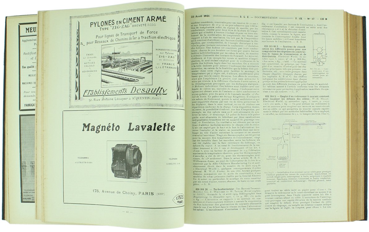 (Codice RA/1308) Recueil des 26+26 chapitres "Documentation" faisant partie des numéros hebdomadaires de la REVUE GENERALE DE L'ELECTRICITE' , tome V/VI et IX/X, reliés en 2 volumes in 8° (26x23 cm) 420+420 pages, environ. Volume 1919: 4 Janvier à 27 Décembre (26 nn.) - Volume 1921: 1 Janvier à 31 Décembre (26 nn.) Nombreuses illustrations. Reliures cartonnées du temps, très bon état. Le couple des deux volumes ~~~ SPEDIZIONE IN ITALIA SEMPRE TRACCIATA