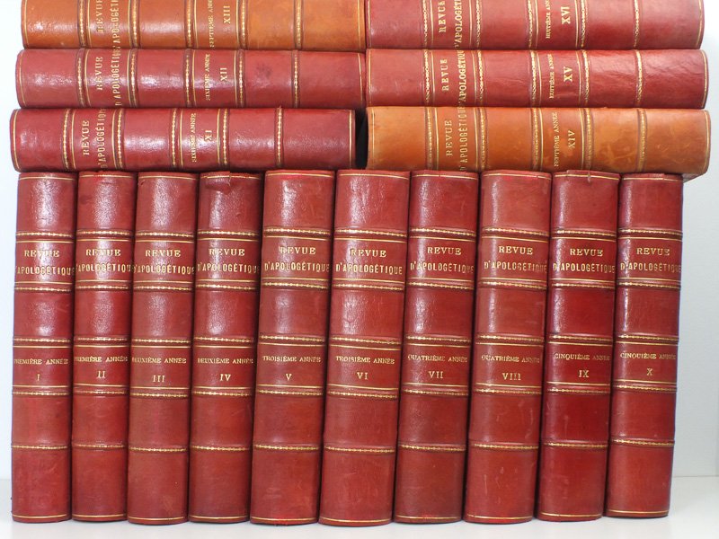 16 vol. in-8 reliure demi-basane rouge, Gabriel Beauchesne et Cie, Paris, 1905-1906 à 1913, circa 580 pp. par volume Bon ensemble relié réunissant la tête de collection de la célèbre Revue d'Apologétique. Etat très satisfaisant (deux petits accrocs en coiffes, bon état par ailleurs). Poids de 15 Kg