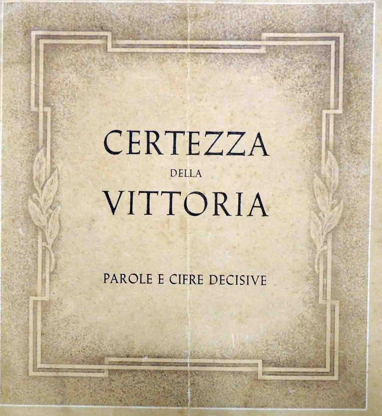 Il tempo lavora per le Potenze dell’ordine del Tripartito. Parole e cifre decisive, tolte dal discorso del ministro degli Affari Esteri del Reich Joachim v. Ribbentrop nel secondo anniversario della firma del Patto Tripartito, il 27 settembre 1942, s.n., s.l., s.d. (ma 1942?), paginazione varia per un totale di 16 carte non numerate, ill. b.n., cm 24x22, pubblicazione spillata. Titolo alla prima di copertina: Certezza della vittoria. Parole e cifre decisive. Ephémère di propaganda del periodo fascista. Tracce d’uso, minime fioriture, lieve brunitura della carta, ma nel complesso ancora buona copia. Raro.