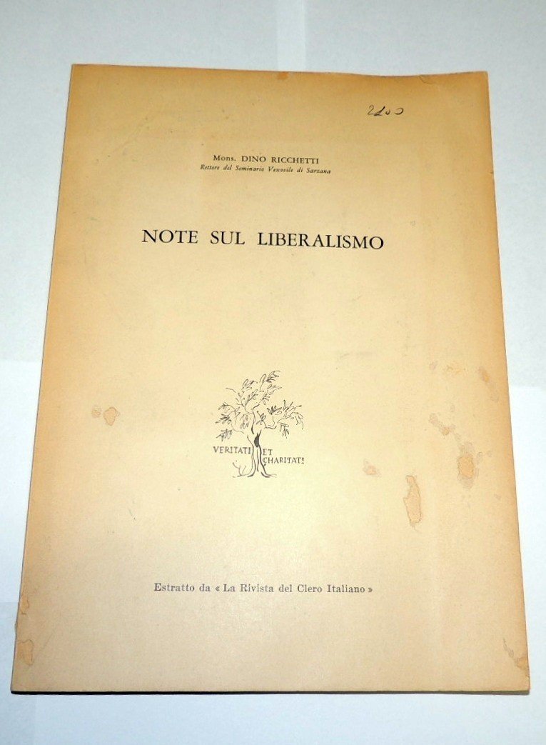 Dino Ricchetti, Note sul liberalismo, Tipografica sociale, Monza 1963, pp. 71, cm 25, br. ed. Estratto da La Rivista del Clero Italiano. Tracce d'uso alla copertina, per il resto buon esemplare.