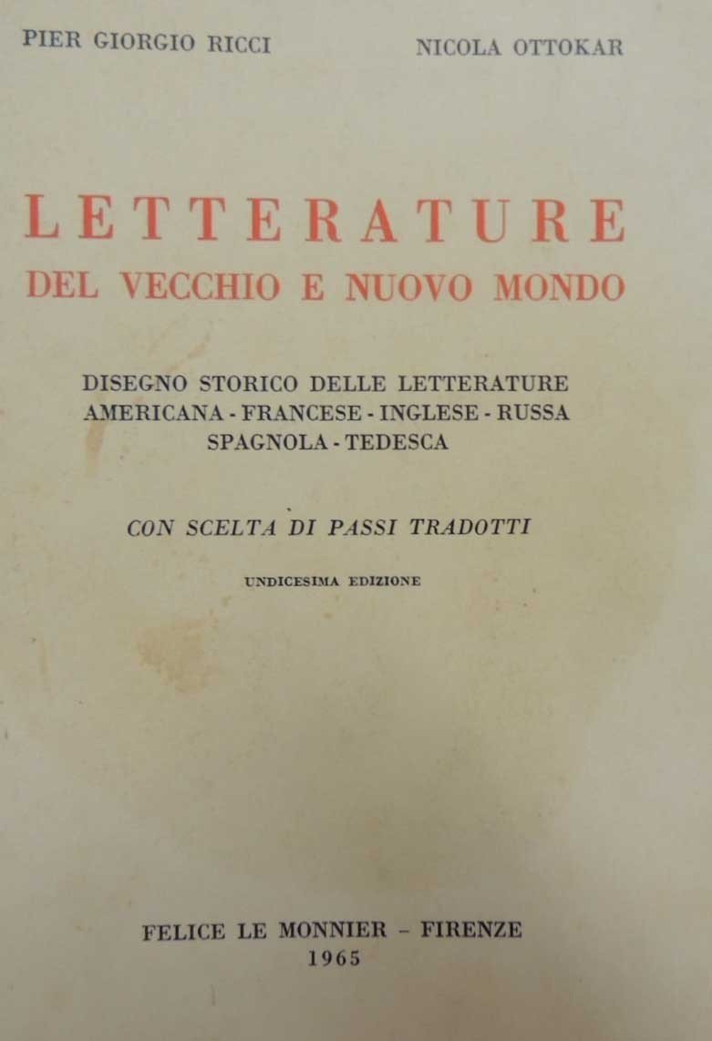 Pier Giorgio Ricci, Nicola Ottokar, Letterature del vecchio e nuovo mondo. Disegno storico delle letterature americana, francese, inglese, russa, spagnola, tedesca. Con scelta di passi tradotti, Felice Le Monnier, Firenze 1965, undicesima ed., pp. VI, 525, cm 20, br. ed. Lievi tracce d’uso, minime fioriture, qualche ingiallitura, per il resto buona copia.