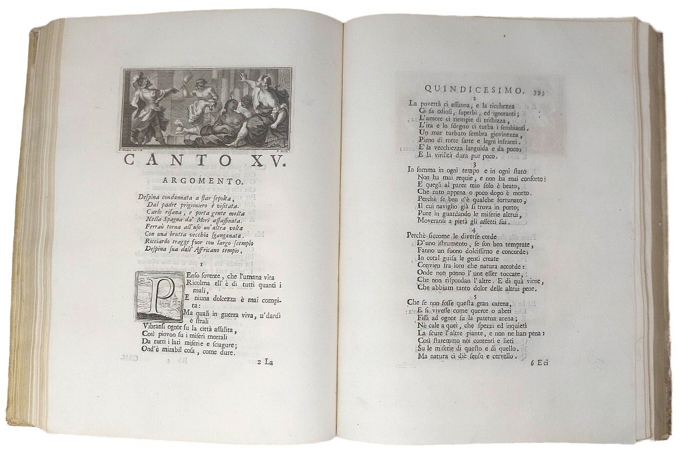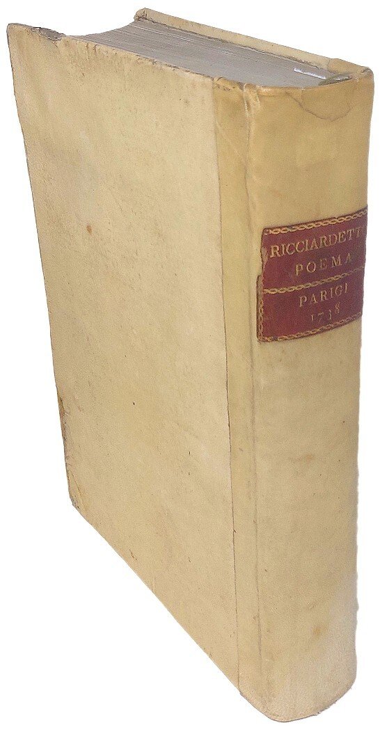 >2 vol. in un tomo, in-4, pp. XXXVI, 420; (2), 412; legatura coeva in pergamena, tassello in pelle con tit. oro al dorso (restaurato). Tit. in rosso e nero, con bella vignetta incisa da F. Zucchi dal disegno di G. Ghedini; finissimo ritratto dell'autore inciso in antiporta; 18 graziosi finalini e 30 capilettera istoriati incisi; 30 eleganti testate su 1/3 di pagina disegnate da G. Ghedini ed incise con maestria da F. Zucchi, Cattini, M. Pitteri, P. Monaco. Prima edizione, pregiatissima, pubblicata postuma e con il nome dell'autore grecizzato, di questo poema giocoso in ottava rima, in cui il Forteguerri (1674-1735) sfrutta e porta all'estremo limite i procedimenti narrativi caratteristici del vecchio poema cavalleresco. Esemplare in carta grande (mm.280x210), assai fresco ed a pieni margini. Gamba 2241: ''Ediz. originale, nitida e non mutilata, come lo furono alcune delle posteriori''. Melzi p.252. Razzolini 153. Morazzoni, p. 220 e 35: ''Il volume può meritare considerazione per le 30 vignette poste a commento del burlesco poema...anche questo è un libro da pregiare''. Parenti, Prime ediz., 237.