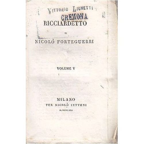 RICCIARDETTO di Niccolò Forteguerri. SOLO IL VOLUME V. Milano, per Nicolò Bettoni , 1830. 162 pagine. Copertina editoriale in brossura. Dimensioni: 8 x 13,5 cm. Stato di conservazione: molto buono (timbro di appartenenza su piatto anteriore e frontespizio, fioriture)