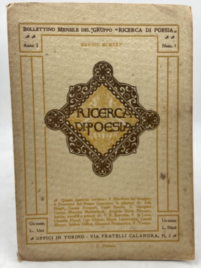 RICERCA DI POESIA. ANNO I Num. 1 MAGGIO MCMXXV [1925]. Bollettino Mensile del Gruppo Ricerca di Poesia.