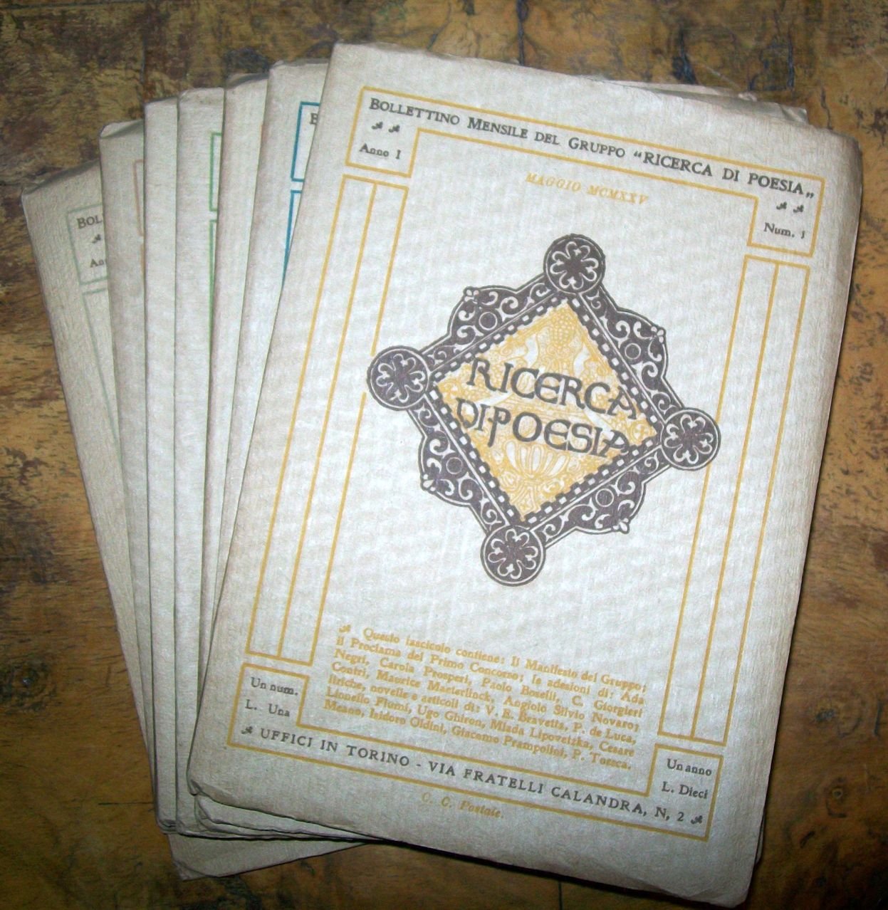 8 fascicoli in 16°, pp. 240 complessive (numerazione continua). Copertina editoriali figurate. Ottimo stato. Rivista mensile, fondata e diretta da Cesare Meano, uscita a Torino da maggio a dicembre 1925. La rivista si proponeva di promuovere la rinascita della poesia italiana, si distinse soprattutto per le traduzioni di testi stranieri, grazie all'opera di Giacomo Prampolini.