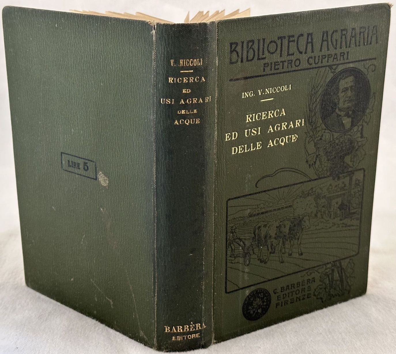 Edizione del 1904 di questo volume sull'utilizzo agrario delle acque scritto da V. Niccoli. Numerose incisioni all'interno. Tra gli argomenti trattati: Della irrigazione, Ricerca estrazione condotta distribuzione delle acque irrigue (sorgenti, eventuale sollevamento delle acque, Derivazioni da acque esterne naturalmente scorrenti o stagnanti, Derivazioni da serbatoi e laghi artificiali, dei metodi o sistemi di irrigazione, La pratica e l'economia della irrigazione), Usi domestici ed industriali, Colmate di monte ecc. In buone condizioni. Copertina in tela editoriale in buone condizioni generali con lievi usure ai margini e dorso. Legatura in discrete condizioni con lievi rotture. Pagine in buone condizioni con rare fioriture. In 8. Dim. 19x13 cm. Pp. 481+(1). Edition of 1904 of this volume about the agricutltural usage of waters written by V. Niccoli. Different engravings inside. In good conditions. Cloth editorial cover in good general conditions lightly worn in the extremities. Binding in fair conditions with light cracks. Inside pages are in good conditions with occasional foxing. In 8. Dim. 19x13 cm. Pp. 481+(1).