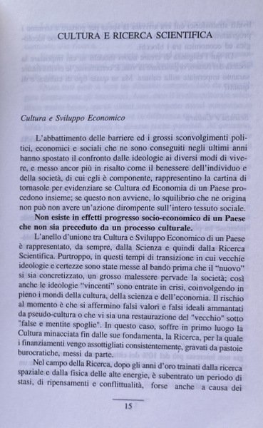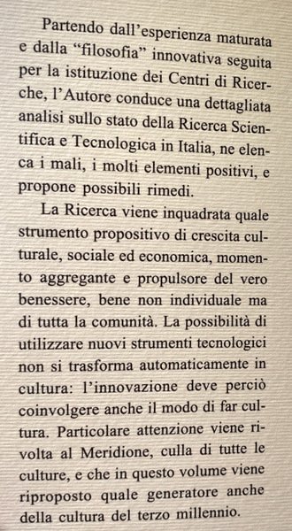 L'autore conduce una analisi sullo stato della ricerca scientifica e tecnologica in Italia, elencandone i mali, gli elementi positivi e proponendo possibili rimedi. La ricerca viene inquadrata quale strumento propositivo di crescita culturale, sociale ed economica, momento aggregante e propulsore del vero benessere, bene non individuale ma di tutta la comunità. Particolare attenzione viene rivolta al Mezzogiorno, che in questo volume viene riproposto quale generatore anche della cultura del terzo millennio.