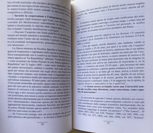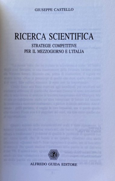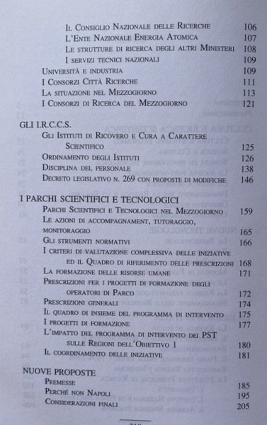 Soggetti: Scienza, Scienze, Ricerca scientifica, Opere generali, Italia meridionale, Mezzogiorno, Divario Nord-Sud, Università, Sapere scientifico, Metodo, Istituzioni, Finanziamenti, Innovazioni, Parchi scientifici, Scienziati, Cultura scientifica, Lavori, Pubblicazioni, Editoria, Innovazione, Società, Stato, Enti pubblici, Formazione permanente, Laboratori scientifici, Competitività, Competizione, Economia, Talento, Competenze, Valorizzazione, Decreti, Leggi, Disposizioni legislative, Regolamenti, Norme, Burocrazia, Apparati, Ministeri, Fondazioni, Fondi, Capitalismo, Globalizzazione, Sfide, Premialità, Diritto, Obiettivi, Consultazione, Riferimento, Studi scientifici, Capitale, Industrie, Management, Sanità, Chimica, Biologia, Medicina, Ingegneria, Fisica, Astronomia, Spazio, Poli tecnologici, Tecnologia, Automazione, Sistema, Valutazioni, Risorse, America, Stati Uniti, Gran Bretagna, Francia, Privatizzazioni, Relazioni internazionali, Confronti, Estero, Giovani, Facoltà scientifiche, Scuola, Istruzione, Metodologia scientifica, Riviste, Bibliografia, Libri Vintage Fuori catalogo, Saggistica, Intellettuali, Pensiero, Comunicazione, Ambiente, Natura, Biotecnologie agroalimentari, Oncologia, Statistica, Malattie, Cure, Progresso scientifico, Evoluzione, MURST, CNR, Energia, Sfruttamento, Mass Media, Decision-makers, Dibattiti, Conoscenze, Politica, Nozioni, Nucleare, Divulgazione, Strumenti, Specializzazione, Consulenze, Fuga dei cervelli, Concorsi, Bandi, Borse di studio, Masters, Certificazioni, Alfabetizzazione funzionale, I.R.C.C.S., Consorzi, ISTAT, Sistema universitario, Baronaggio, Inefficienza, Selezione, Dottorati, Brevetti, Genetica, Industria farmaceutica, Multinazionali, Imprese, Mercato, Informatica, Silicon Valley, Zootecnica, Agenzia Spaziale, Atomica, Risorse umane, Sciences, Scientific research, General works, Southern Italy, North-South divide, University, Scientific knowledge, Method, Institutions, Funding, Innovations, Science parks, Scientists, Scientific culture, Works, Publications, Publishing, Innovation, Society, State, Public bodies, Lifelong learning, Scientific laboratories, Competitiveness, Competition, Economy, Talent, Skills, Enhancement, Decrees, Laws, Legislative provisions, Regulations, Standards, Bureaucracy, Apparatus, Ministries, Foundations, Funds, Capitalism, Globalization, Challenges, Rewards, Law, Goals, Consultation, Reference, Scientific studies, Capital, Industries, Management, Healthcare, Chemistry, Biology, Medicine, Engineering, Physics, Astronomy, Space, Technological poles, Technology, Automation, System, Evaluations, Resources, United States, Great Britain, France, Privatization, International relations, Comparisons, Abroad, Young people, Scientific faculties, School, Education, Methodology, Magazines, Bibliography, Out of print books, Non-fiction, Intellectuals, Thought, Communication, Environment, Nature, Agri-food biotechnologies, Oncology, Statistics, Diseases, Cures, Scientific progress, Evolution, Energy, Exploitation, Debates, Knowledge, Politics, Notions, Nuclear, Dissemination, Tools, Specialization, Consulting, Brain drain, Competitions, Calls, Scholarships, Certifications, Functional literacy, Consortia, University system, Baronage, Inefficiency, Selection, Doctorates, Patents, Genetics, Pharmaceutical, Multinationals, Businesses, Market, Information Technology, Animal Husbandry, Space Agency, Atomic, Human Resources