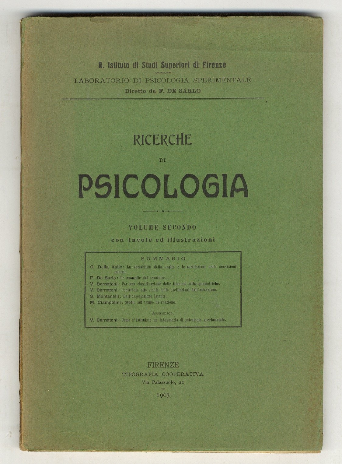 Firenze, Tipografia Cooperativa, 1907, in-8, brossura editoriale (lieve mancanza al dorso), pp. 148, XXV. Con 8 tavole (una ripiegata, le altre comprese nella paginazione) Articoli di G. Della Valle, F. De Sarlo, V. Berrettoni, S. Montanelli, M. Ciampolini. Vol. del Laboratorio di psicologia sperimentale, diretta da F. De Sarlo.