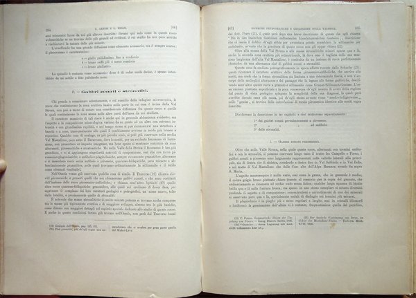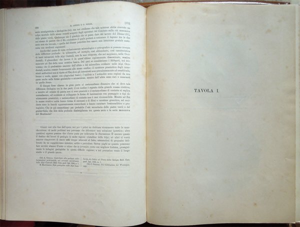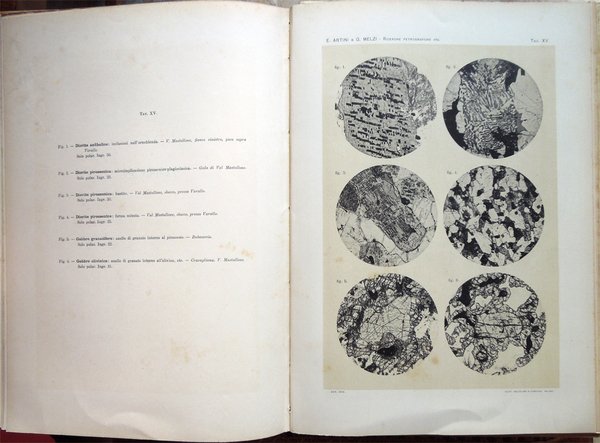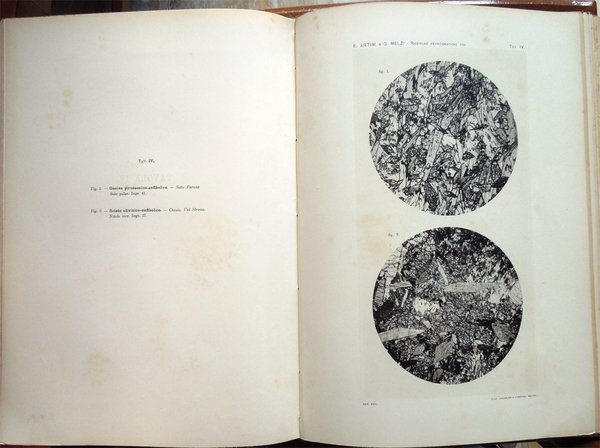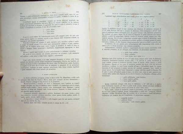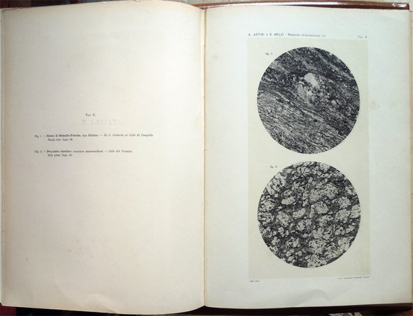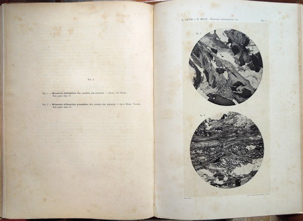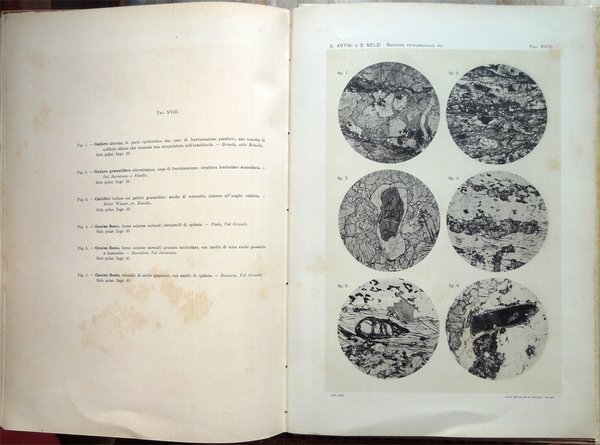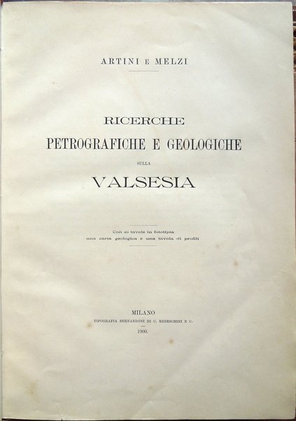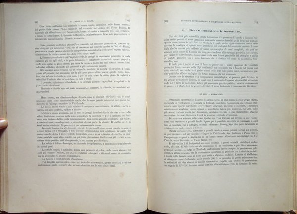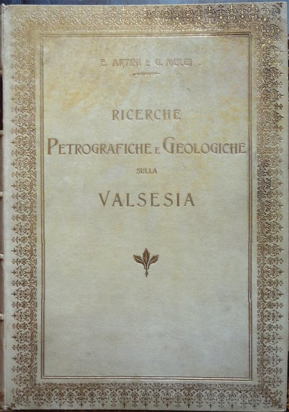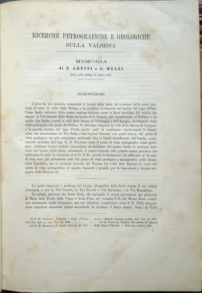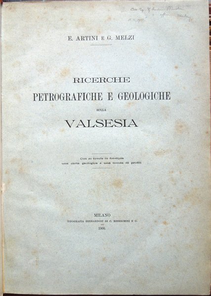 In-4° (34 x 24 cm), pp. (2), VI, 219-390, (88) ospitanti ventidue tavole fuori testo, bella legatura coeva in piena pergamena, con titoli in oro al piatto anteriore e al dorso, al piatto anteriore, entro doppia cornice impressa, anch'essa in oro, con la parte esterna formata da fregi e quella interna da un doppio filetto, al dorso, su tassello in pelle. Dorso, a sei scomparti, ornato da fregi e filetti in oro. Normali, lievi segni del tempo alla legatura, in particolare una traccia d'umido nell'angolo superiore esterno del piatto anteriore. Il titolo al tassello al dorso riporta un errore, "microscopiche" anziché "geologiche". Con ventidue tavole in fine, fuori testo, venti, con numerazione romana I-XX, in bianco e nero, protette da foglio volante di velina, ospitanti immagini di sezioni di minerali, due, con numerazione araba 1-2, a colori, raffiguranti la prima "Abbozzo di carta geologica", la seconda "Profili geologici". Conservata la copertina anteriore originale con, nell'angolo superiore esterno, invio autografo firmato di uno degli autori, Ettore Artini, datato 1903. Conservato il segnacolo originale. Doppie carte di guardia: al recto della prima e al verso dell'ultima, e ai contropiatti, applicata dal legatore bella carta marmorizzata a motivo caillouté di colore grigio-azzurro. Piccoli e leggeri segni d'umido ai tagli e alla copertina originale; tracce d'umido anche a qualche pagina e ad alcune tavole (vedi foto). Nel bordo inferiore, bianco, del foglio con le pagine 359-360, uno strappetto, senza perdite, rimarginato con carta giapponese. Per il resto, molto ben conservato. Non comune. Estratto originale. Fondamentale studio sulla petrografia e la mineralogia della Valsesia, redatto da Ettore Artini e Gilberto Melzi, pubblicato nelle Memorie del R. Istituto lombardo di scienze e lettere, in splendida e raffinata rilegatura coeva in piena pergamena. Indice: Introduzione. Bibliografia. Parte petrografica. I. Gneiss-Strona. A. Micascisti a sillimanite. B. Gneiss granulari biotitici. C. Gneiss a due miche. D. Gneiss pellicolari a microclino. E. Gneiss minuti biotitici. F. Gneiss ghiandolari anfibolici. G. Granuliti pirosseniche. H. Gneiss dioritici. I. Gneiss pirossenico-anfibolici. L. Gneiss minuti tormaliniferi. M. Anfiboliti. N. Rocce oliviniche e serpentinose. O. Calcifiri. P. Appendice al Gneiss-Strona. Graniti. II. Rocce massicce pirossenico-anfiboliche. A. Dioriti. B. Rocce gabbriche. C. Peridotiti, pirosseniti, orneblenditi. D. Gabbri zonati e stronaliti. E. Rocce filoniane basiche. F. Anfiboliti e scisti dioritici. G. Forme laminate delle rocce massicce. H. Appendice. Calcari compresi nelle rocce eruttive. III. Gneiss-Sesia. A. Gneiss chiari scistosi. B. Micascisti. C. Rocce prasinitiche. D. Rocce massicce intercalate. E. Gneiss ghiandolari. F. Gneiss minuti zonati. G. Calcari. H. Scisti di Rimella e Fobello. IV. Pietre verdi. A. Prasiniti. B. Anfiboliti e scisti anfibolici. C. Eclogiti. D. Serpentini e rocce oliviniche. E. Calcescisti e calcari saccaroidi. F. Micascisti granatiferi e gneiss chiari. G. Scisti quarzitici. V. Gneiss-Monte Rosa. A. Gneiss porfiroidi. B. Gneiss minuti, micascisti, ecc. Parte geologica. I. Gneiss-Strona. A. Zona occidentale. B. Zona orientale. C. Graniti. D. Contatto del Gneiss-Strona con le rocce eruttive granitiche e dioritiche. II. Rocce eruttive basiche. A. Dioriti. B. Gabbri e noriti. C. Peridotiti, pirosseniti, orneblenditi. D. Gabbri zonati e stronaliti. E. Spessartiti. F. Calcari. G. Fenomeni dovuti al dinamometamorfismo. III. Gneiss-Sesia. IV. Pietre verdi. V. Gneiss-Monte Rosa. Conclusioni.
