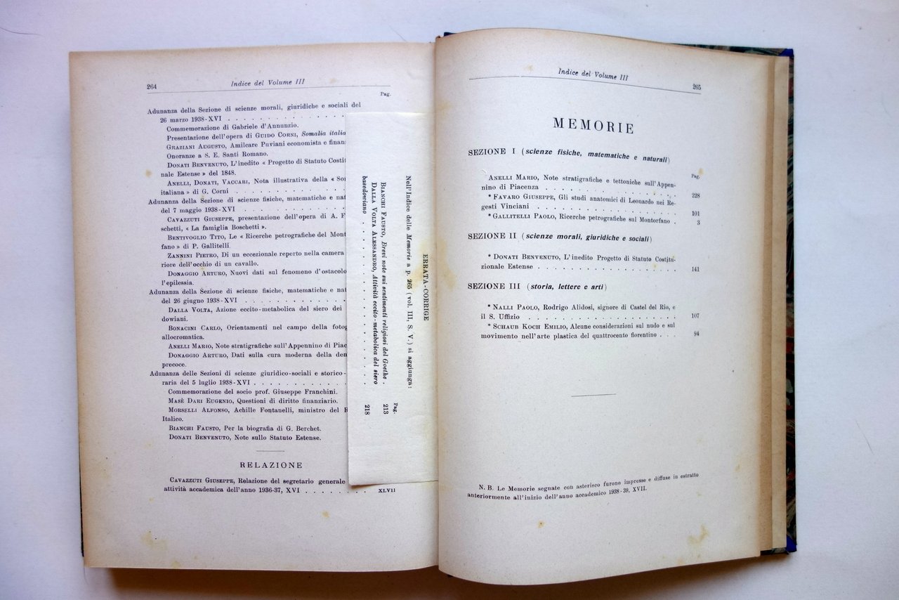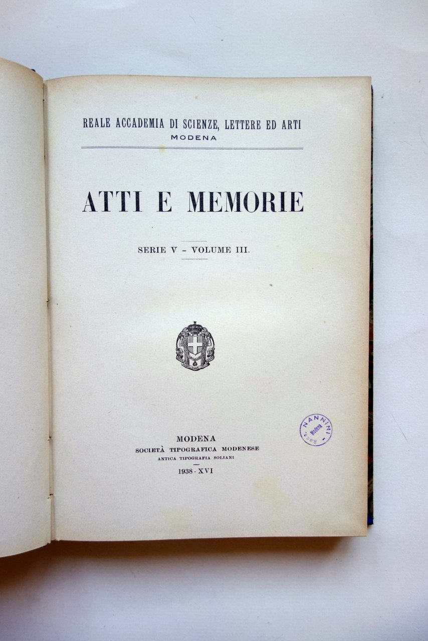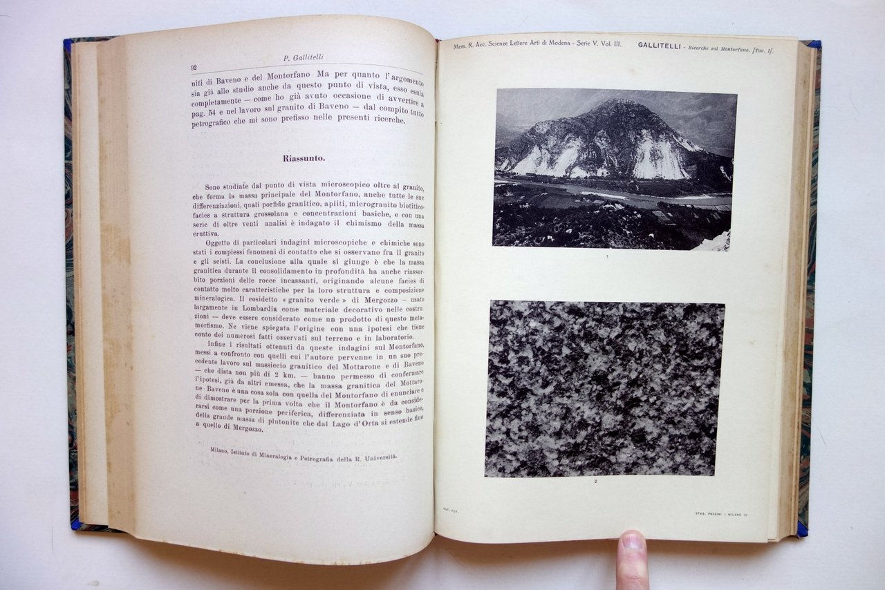 AA. VV., Ricerche petrografiche sul Montorfano (Lago Maggiore) di Paolo Gallitelli in "Atti e Memorie della Reale Accademia di Scienze, Lettere e Arti di Modena" Serie V - Volume III 1938 Soc. Tip. Modenese, Modena 1938; cm 24,5x17,5; pp. LVI-266; l'articolo del Gallitelli, completo, è alle pp. 1-93 ed è corredato da 3 tavv. in b/n fuori t.; legatura d'epoca in mezza pelle con titolo al dorso, piatti marmorizzati. Al frontespizio timbretto - ex libris del precedente proprietario. Numero completo. Condizioni di conservazione Esemplare in buone condizioni con tracce d'uso; tagli con alcune piccole leggere bruniture. Interni buoni. l'articolo del Gallitelli, completo, è alle pp. 1-93 ed è corredato da 3 tavole in bianco e nero fuori testo. Numero completo. Per un elenco degli altri articoli qui contenuti vedi foto indice. SETT137.L22256 N "