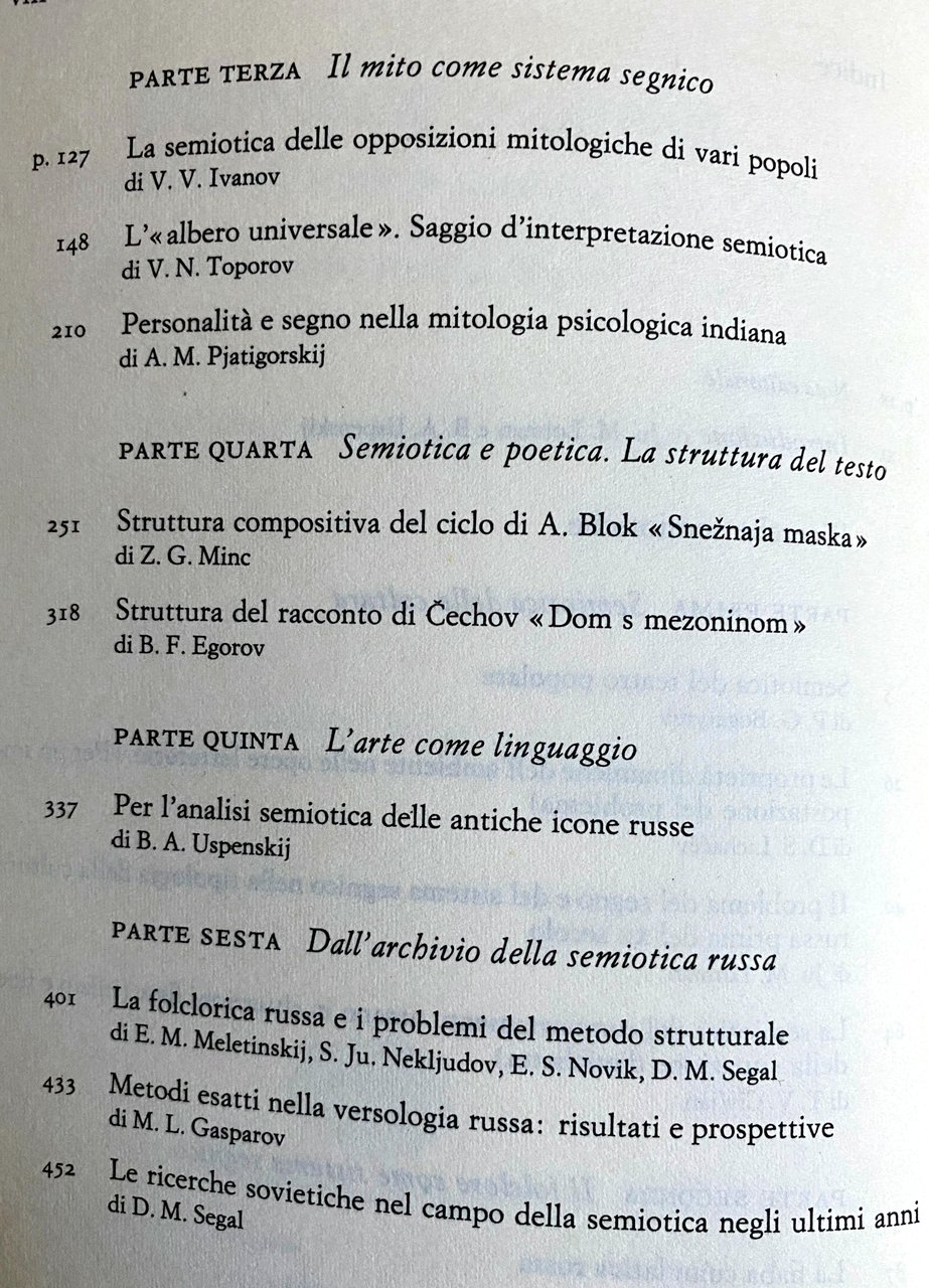 Autori Vari: Pëtr Grigor'evic Bogatyrëv, Dmitrij Sergeevic Lichacëv, Jurij M. Lotman, T. V. Civ'jan, Vladimir Jakovlevic Propp, Sergey Yurievich Neklyudov, Vjaceslav Vsevolodovic Ivanov, Vladimir Nikolaevic Toporov, Alexandr M. Pjatigorskij, Zara Grigor'evna Minc, B. F. Egorov, Boris A. Uspenskij, E. M. Meletinskij, E. S. Novik, D. M. Segal, M. L. Gasparov