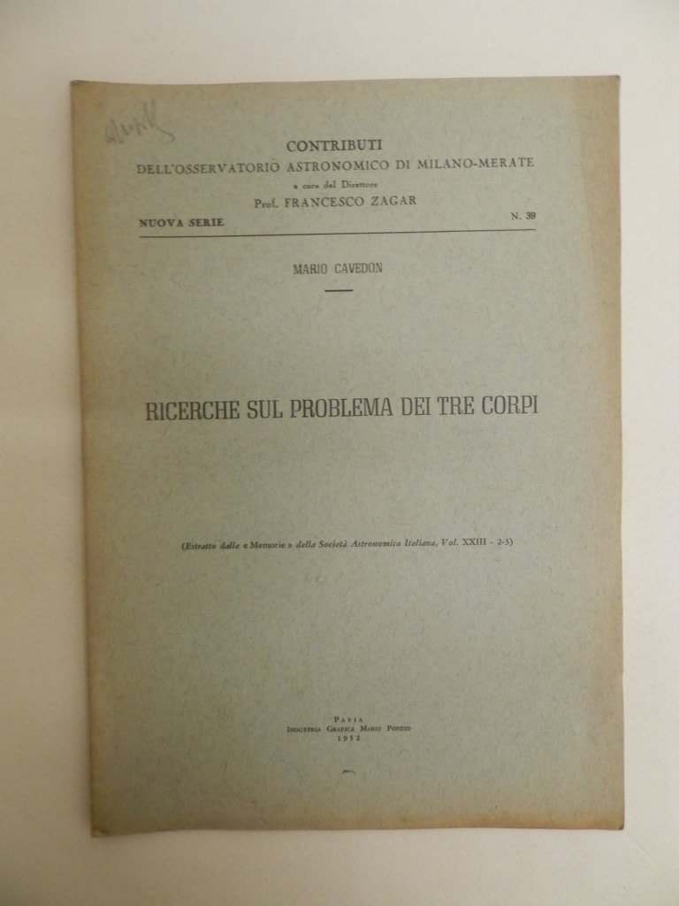 8^, pp. 12, 2 figure nel testo e una tavola ripiegata fuori testo, brossura editoriale, titolo al piatto, esemplare molto buono. Estratto dalle memorie della società astronomica italiana, vol. XXIII, 2-3. Analisi delle teorie di Poincarré dei tre corpi in astronomia e osservazione di alcuni fenomeni presso l'osservatorio astronomico di Brera. *** TUTTI I NOSTRI LIBRI SONO VISIBILI PREVIO CONTATTO MAIL O TELEFONO NELLA NUOVA SEDE DI MILANO: LIBRERIA COSMOPOLIS, VIA JOMMELLI, 22. ***