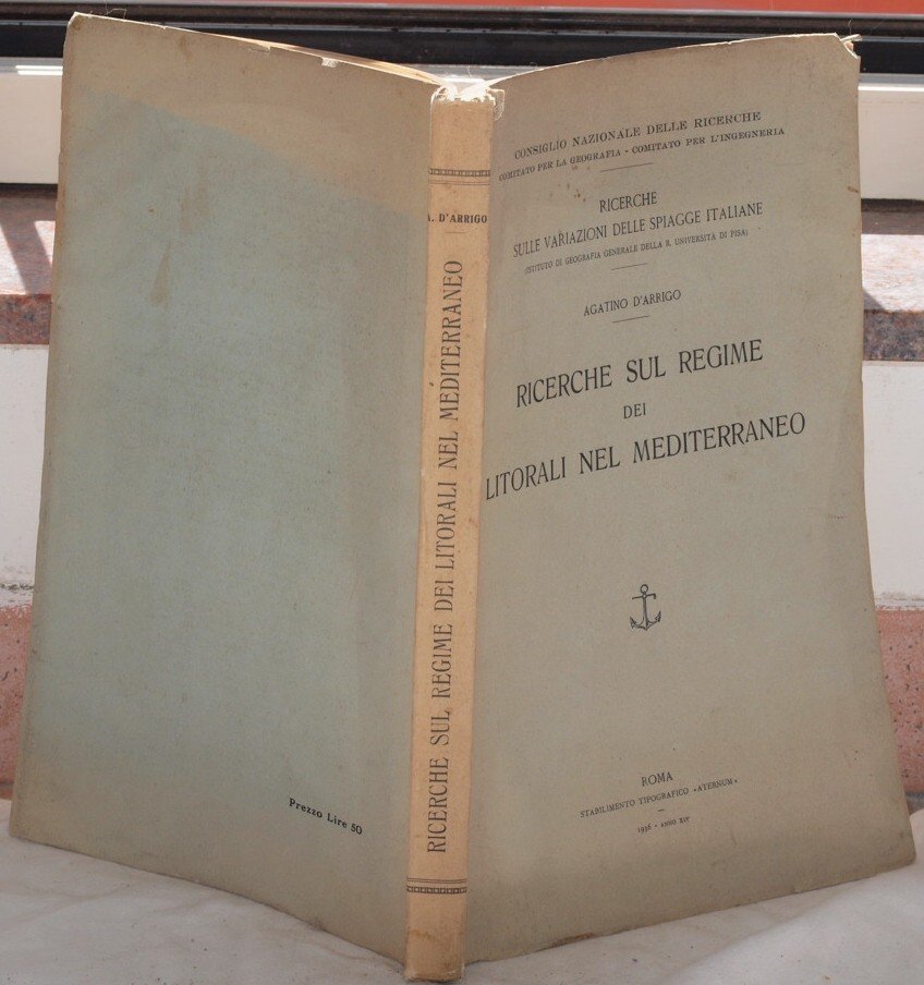 In 4. Dim. 31,5x21 cm. Pp. VIII+172+(8). Prima edizione del 1936 di questa interessante opera di Agatino d'Arrigo edito dal CNR Comitato per la geografia e per l'ingegneria per le ricerche sulle variazioni delle spiagge italiane. Il volume presenta le ricerche sul regime dei litorali nel mediterraneo. Tra gli argomenti trattati: problemi ed indagini sull'azione morfolitologica del mare lungo i litorali in particolare il Mediterraneo (azione del moto ondoso, correnti, azione morfologica causata dal moto del mare), processo evolutivo di una spiaggia, rifrazione del moto ondoso; ricerche comparate morfolitologiche sul regime dei litorali nel Mediterraneo (delta del Nilo, delta Padano, delta del Rodano, delta del Tevere, baia di Taormina, litorale di Algeri, promontorio Argentario), conclusioni. Alla fine del volume sono presenti otto planches colorate ripiegate più volte che mostrano le variazioni della linea di costa di alcune spiagge italiane e dei fiumi che sboccano nel Mediterraneo: il delta del Nilo, il delta del Po, l'alto Adriatico, il delta del Rodano, il delta del Tevere, la baia di Taormina, il litorale di Algeri, il promontorio dell'Argentario. Interessante per verificare la condizione dei litorali italiani In ottime condizioni Brossura editoriale in buone condizioni generali con usure e strappi ai margini e dorso. Legatura in ottime condizioni. All'interno le pagine si presentano in ottime condizioni con rare fioriture. First edition of 1936 of thsi interesting work by Agatino d'Arrigo edited by CNR Comitee for geography and engineering for the researches on variations of italian sands. The volume shows the researches of coasts in mediterranean sea. Among the issues treated: problems about the morpholitological action of sea on coasts in particular the mediterranean sea, evolutive process of a beach coast, compared researches on mediterranean beach coasts (delta del Nilo, delta Padano, delta del Rodano, delta del Tevere, baia di Taormina, litorale di Algeri, promontorio Argentario), conclusions At the end of the volume there are eight coloured folded planches showing the variations of coast line of some italian bech coasts and of rivers of the MEditerranean sea: il delta del Nilo, il delta del Po, l'alto Adriatico, il delta del Rodano, il delta del Tevere, la baia di Taormina, il litorale di Algeri, il promontorio dell'Argentario. Interesting to verify the condition of mediterranean coasts. In very good conditions. Editorial cover in good general conditions with wearings and missing parts in the edges and spine. Binding in very good conditions. Inside pages are in very good conditions with occasional foxings.