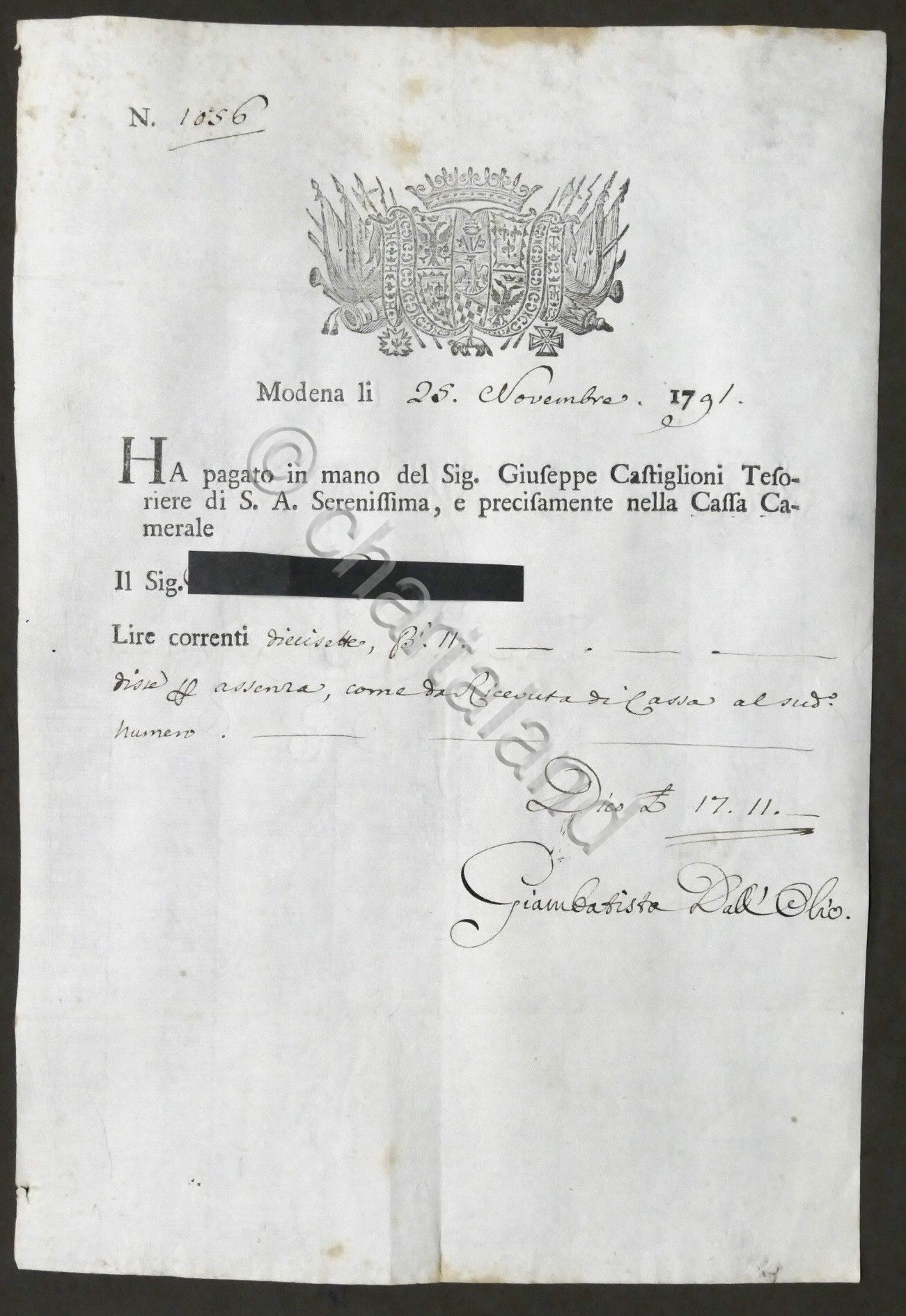 Ricevuta di Pagamento - Cassa Camerale di Modena - 25 Novembre 1791
