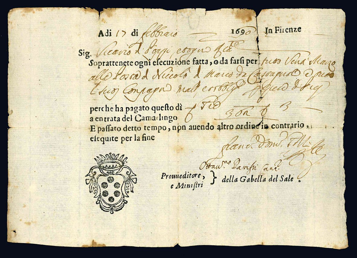Ricevuta di pagamento rilasciata dal Provveditore e dai Ministri della Gabella del Sale. Firenze, 17 febbraio 1690.