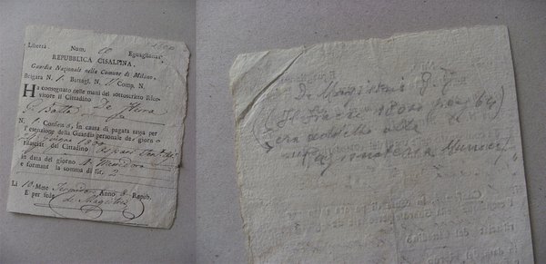 Ricevuta Repubblica Cisalpina - Guardia Nazionale della Comune di Milano 1800