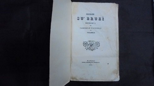 NAPOLI, BOEZIANA, 1839. In 8∞: pp. 4 + 184. Br. rifatta, aloni di vecchia umidit‡. Lievi tracce d`uso. "Antico popolo di stirpe italica che abitÚ la quasi totalit‡ dell`odierna Calabria".