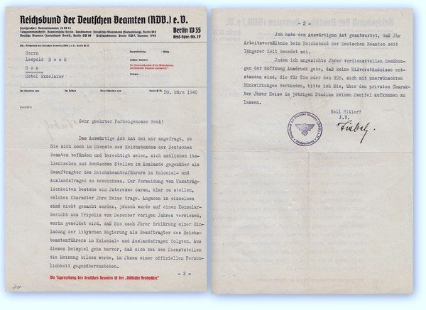 Richiamo del Ministro degli esteri tedesco a Leopoldo Reck 20 Marzo 1940. Documento Nazismo nazista.