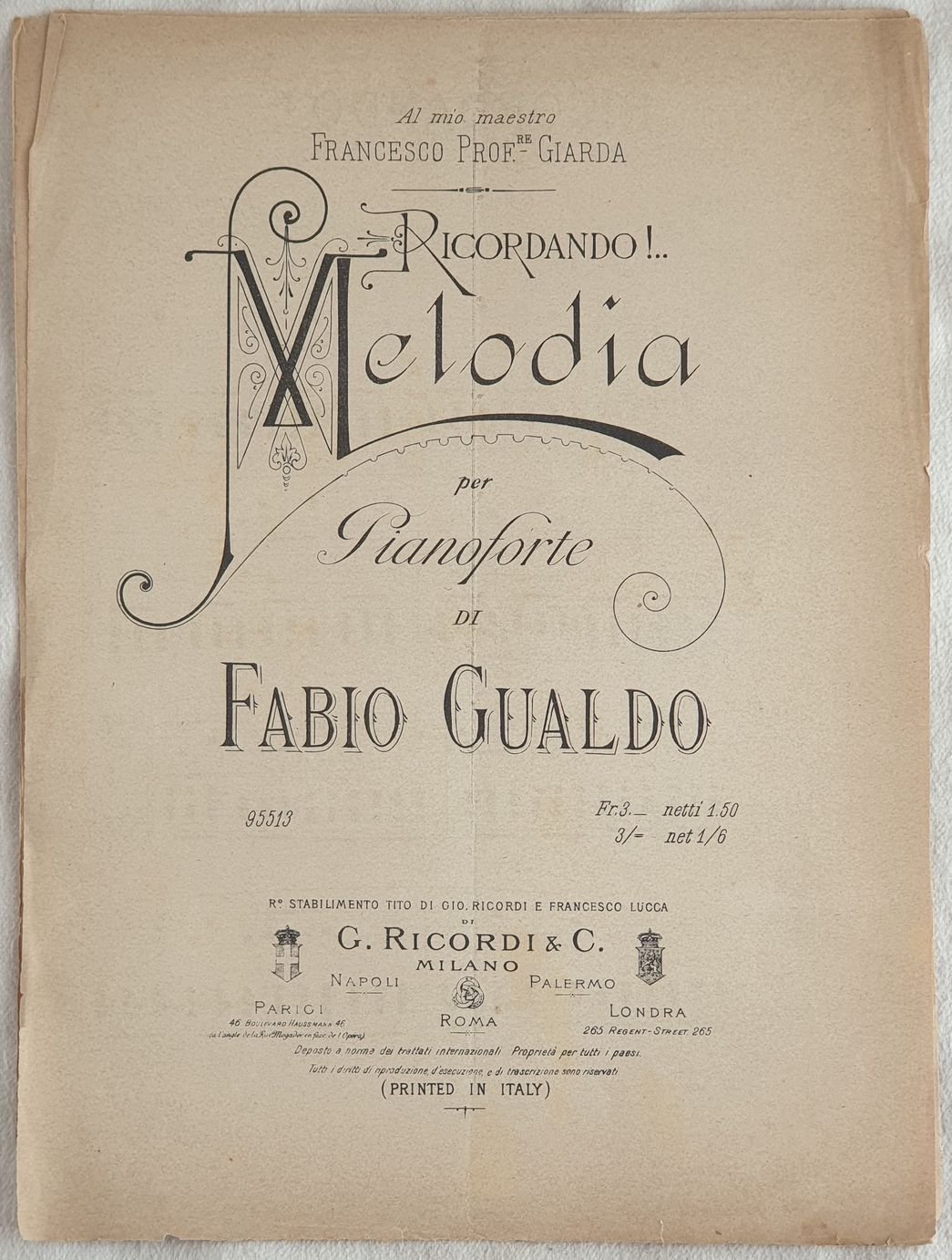 Edizione della fine dell'ottocento di questo spartito per pianoforte del compositore italiano Fabio Gualdo "Ricordando! melodia". Buone condizioni. Legatura assente. In 4. cm 32,5x24. pp. 6. Edition of the end of XIX century of this musical score for piano by the italian composer Fabio Gualdo "Ricordando! melodia". Good conditions. In 4. cm 32,5x24. pp. 6.
