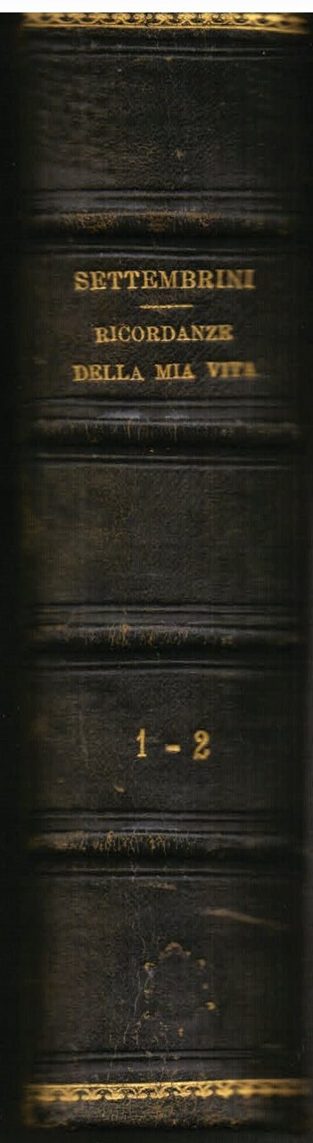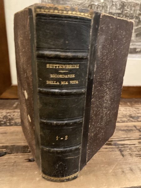 2 tomi in un volume in-16° (188x120mm), pp. (4), XX, 326, (2); CXLII, (2), 326; legatura coeva m. pelle con titolo in oro su dorso a nervetti. Sguardie marmorizzate. Una firma. Buon esemplare. Prima edizione, rara, di uno dei capolavori della memorialistica risorgimentale, pubblicata postuma con prefazione del De Sanctis. 'Queste Ricordanze non sono una storia. La storia è di là da venire; e il predestinato storico, se vuole non solo comprendere ma sentire quei tempi, li cercherà nei documenti contemporanei, gazzette, polemiche, ricordi, storie. Tra questi documenti quello che glie ne darà il sentimento più vivo e il più sincero sono le Ricordanze di Luigi Settembrini. Queste pagine sono scritte giorno per giorno, e a poca distanza, secondo le impressioni momentanee, e in momenti di concitazione geniale; sono un vero giornale della vita. Scritte da un uomo eroico, che, narrando sé stesso, piglia una viva partecipazione agli avvenimenti, attore e testimonio. La sua bonarietà, la sua semplicità, la sua fede viva, i suoi affetti di padre e di marito, le stesse sue esagerazioni che non hanno fiele, e nascono da cuore amante, te lo rendono simpatico, ti ammaliano , e tu prendi interesse insieme per le cose e per la sua persona.' (De Sanctis). Lemmi, 184. Rosi, IV, 273. Biancardi-Francese, p. 415. Silvia Spellanzon in Dizionario Bompiani delle Opere, VI, p. 235.