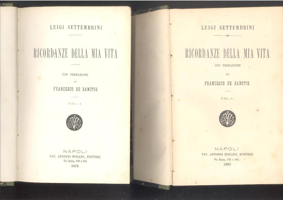 DUE VOLUMI IN 8° ( cm.13 X 19,5 ) COSI RIPARTITI: VOL 1°) pp.XX, 326, INDICE. VOL.2°) pp.CXLII,<BR>( IN CUI SONO DESCRITTE: L'AVVERTENZA, SECONDA PRIGIONIA - CAUSA E CONDANNA, AL SIGNOR PRESIDENTE, PROCURATOR GENERALE, E GIUDICE DELLA G. CORTE CRIMINALE DI NAPOLI. DIFESA DI LUIGI SETTEMBRINI SCRITTA PER GLI UOMINI DI BUON SENSO. DISCARICO. DIFESA DI LUIGI SETTEMBRINI LETTA INNANZI LA CORTE CRIMINLE DI NAPOLI ),<BR>SEGUE L'AVVERTENZA DELL'EDITORE IN CUI LE pp. DI NUMERAZIONE ROMANA DOVEANO FAR SEGUITO AL VOL. COME APPENDICE MA SICCOME SI E CREDUTO PORRE PRIMA LA DIFESA, FU NECESSITA FAR SEGUIRE LA NUMERAZIONE ARABA. - pp.326. LEGATURE COEVE IN MEZZA PELLE CON TITOLI IN ORO AL DORSO, PIATTI CARTONE MARMORIZZATO. . LUIGI SETTEMBRINI ( NA. 1813 - 1877 ), SCRITTORE E PATRIOTA ITALIANO. FREQUENTO LA SCUOLA DI BASILIO PUOTI. ALL'UNIVERSITA FU ALLIEVO DEL FILOSOFO PASQUALE GALLUPPI. INSEGNO ALL'UNIVERSITA DI BOLOGNA E DI NAPOLI. CON MUSOLINO FONDO LA SETTA FIGLIUOLI DELLA GIOVINE ITALIA. CAPOLAVORO DELL'EPOPEA RISORGIMENTALE, FU PUBBLICATA POSTUMA CON PREFAZIONE DI FRANCESCO DE SANCTIS. OTTIMA CONSERVAZIONE GENERALE DEI DUE VOLUMI. PRIMA RARA EDIZIONE. ID, 7105