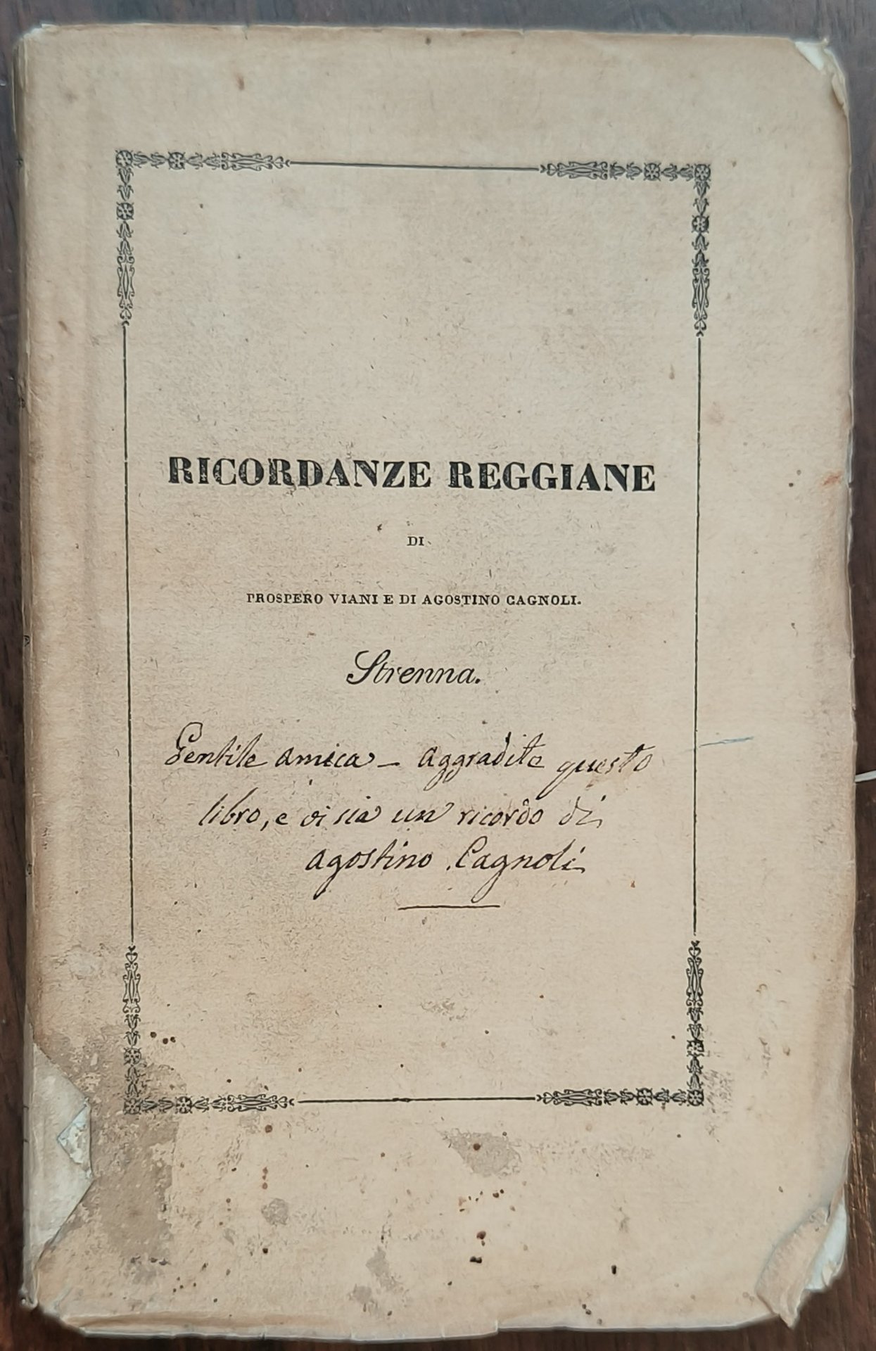 Cm 17. Brossura originale marrone con titolo e fregio. Tracce di colla e etichetta al dorso. Pp. (2) 76 (4). Lievi tracce di usura alla legatura. Al piatto dedica manoscritta di Cagnoli a "Gentile amica". Viani ricostruisce la storia degli studi di letterati reggiani dal XIII al XIX secolo. Cagnoli canta in versi la bellezza dei luoghi a lui noti: Reggio, la Villa dell'Ariosto, Everelina di Rossena, il bosco Tacoli, Selvapiana, le colline reggiane, il Castello di Canossa, Dante alla pietra di Bismantua, per due ossa dell'Ariosto possedute dalla mia famiglia.