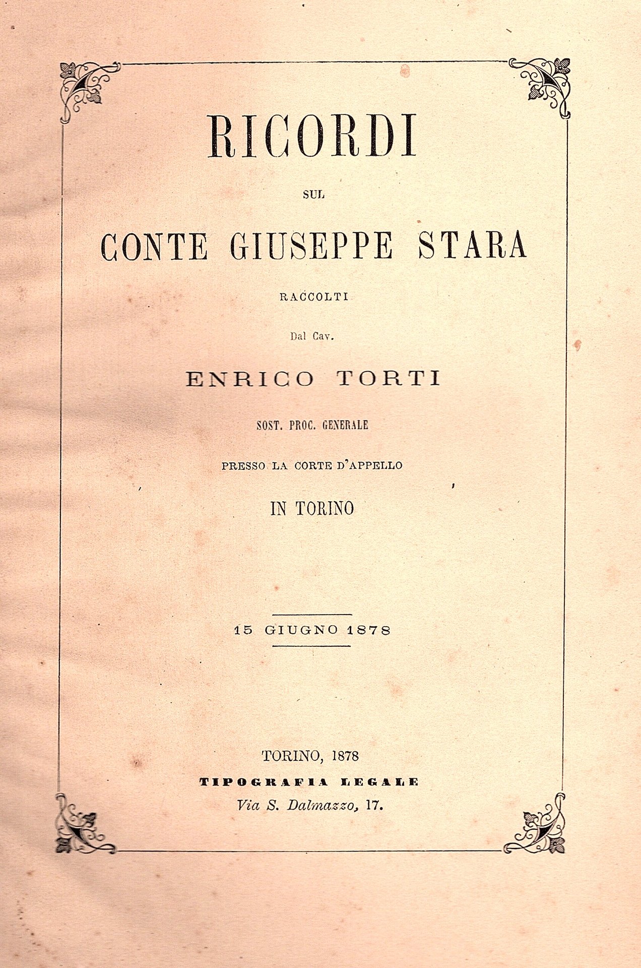 In-8° grande (23.5x16 cm), pp. 103, elegante legatura mezza pelle testa di moro con titoli e fregi dorati al dorso, piatti in percallina con filetti diagonali agli angoli, sguardie decorate, pecetta di legatoria Michele Prandi al contropiatto. Pp 103. Ottima copia appartenente alla biblioteca privata dell'autore. L'autore, sostituto procuratore generale presso la Corte d'Appello di Torino, commemora lo Stara, 'il Nestore dei Magistrati subalpini', nato a Caresanablot, presso Vercelli, nel 1795 e spentosi un anno prima. Indice dei sottoscrittori in fine.
