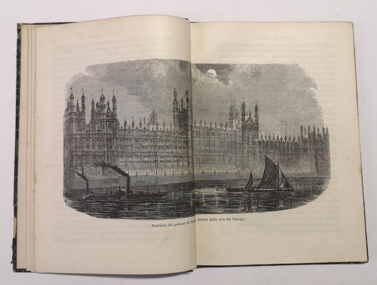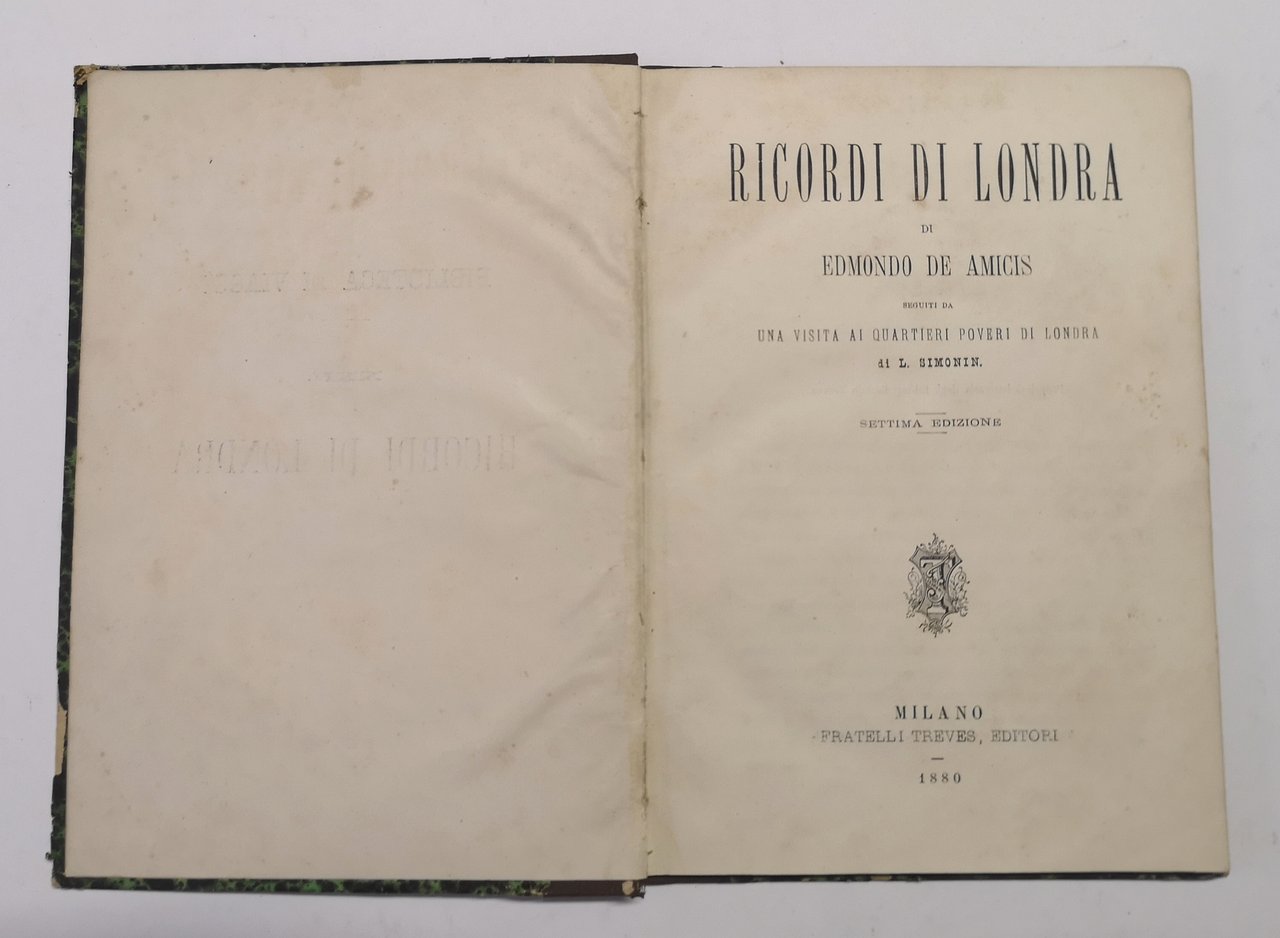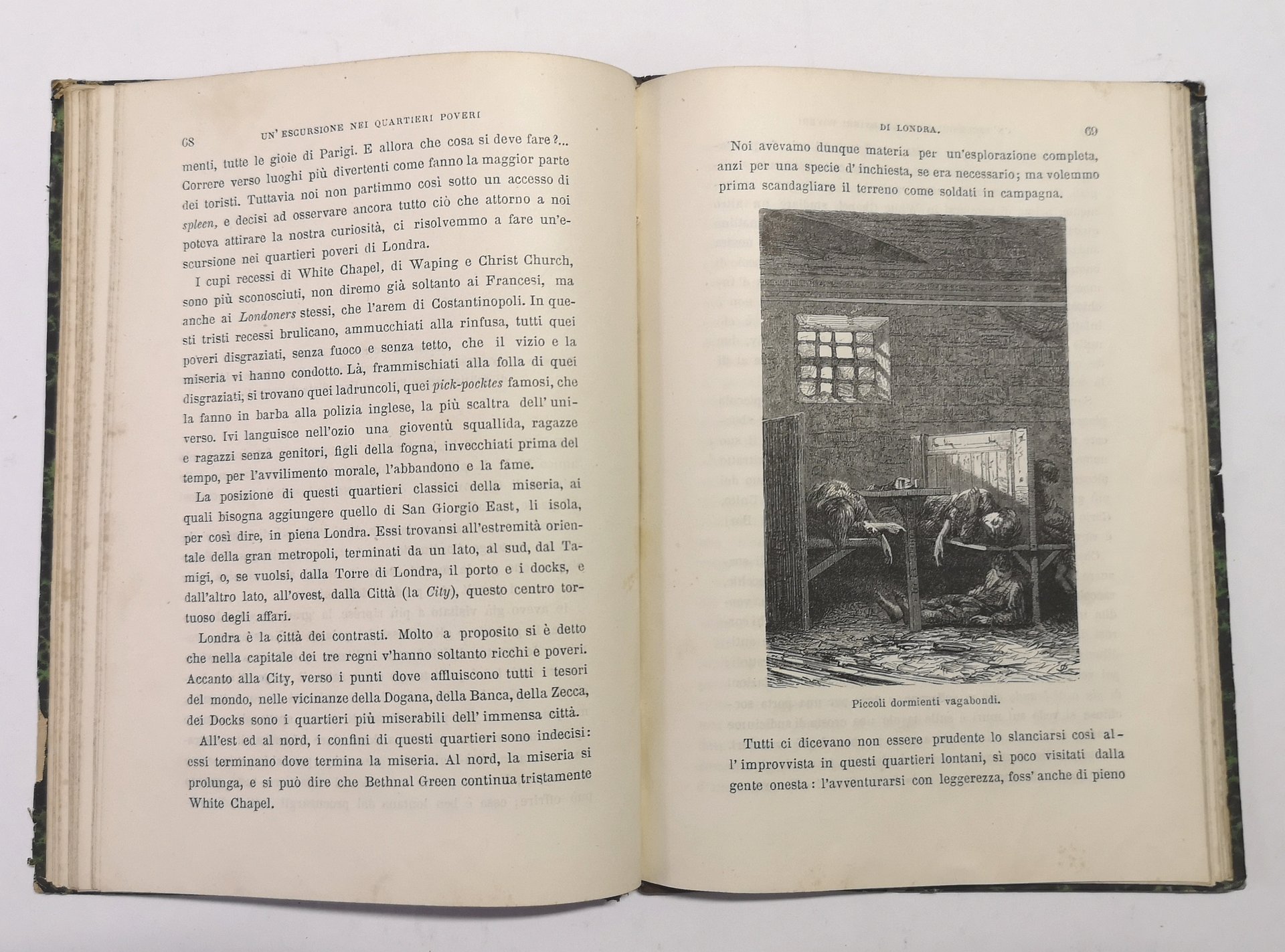>in-8, pp. 110, (2) con numerose figure e vedute xilogr. n.t., anche a doppia pagina. Legatura coeva in m. percallina. Settima edizione, la prima del 1874, di questo entusiastico resoconto su Londra di De Amicis, che ne loda le bellezze architettoniche, la grandiosità ed il progresso: "ma che lezione di modestia è questo viaggiare" (p. 54). La seconda parte a cura di Simonin, per contrasto, espone invece la miseria e il degrado di quartieri poveri come White Chapel, Whaping, Christ Church, San Giorgio East, Bethnal Green. Ottimo esemplare.