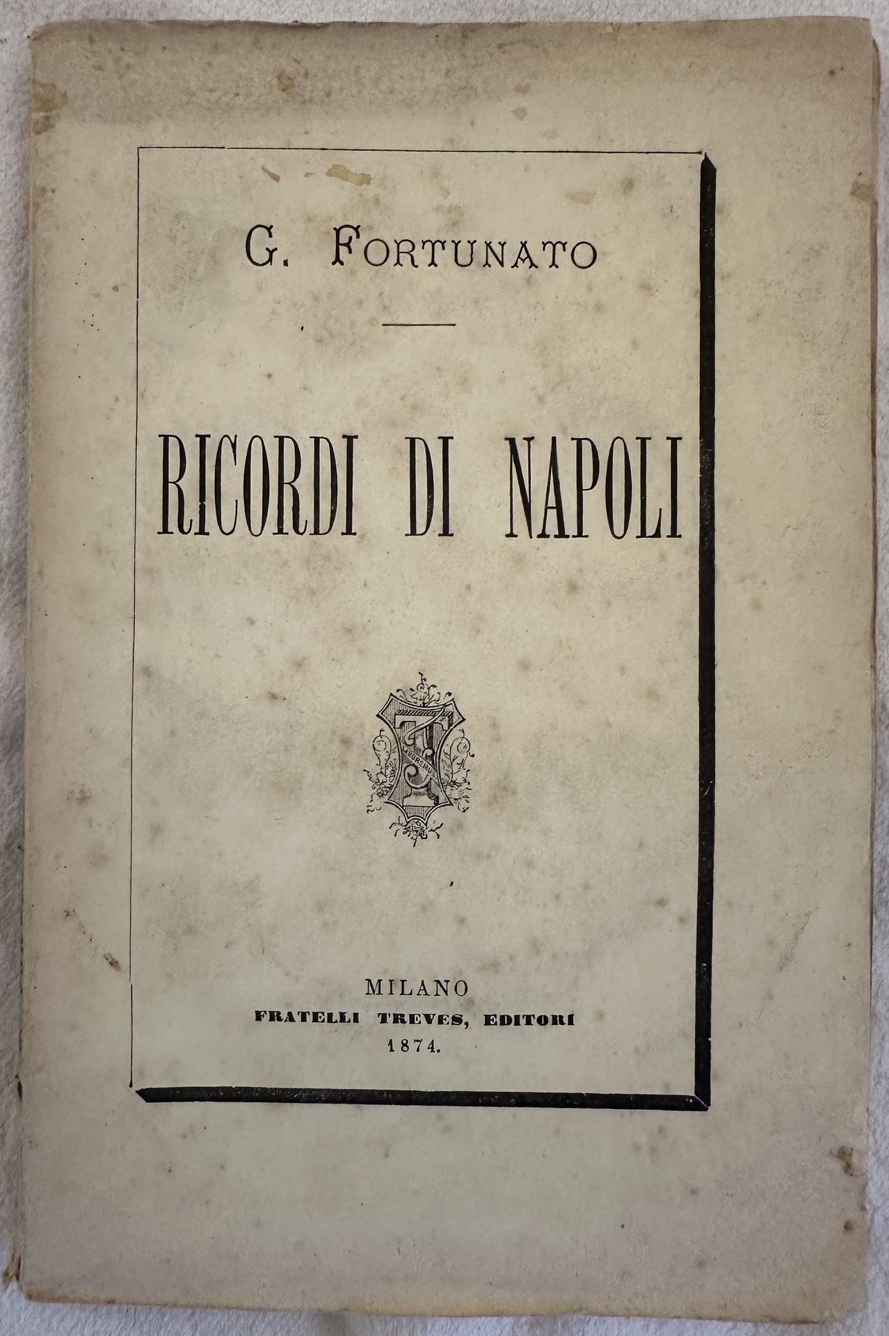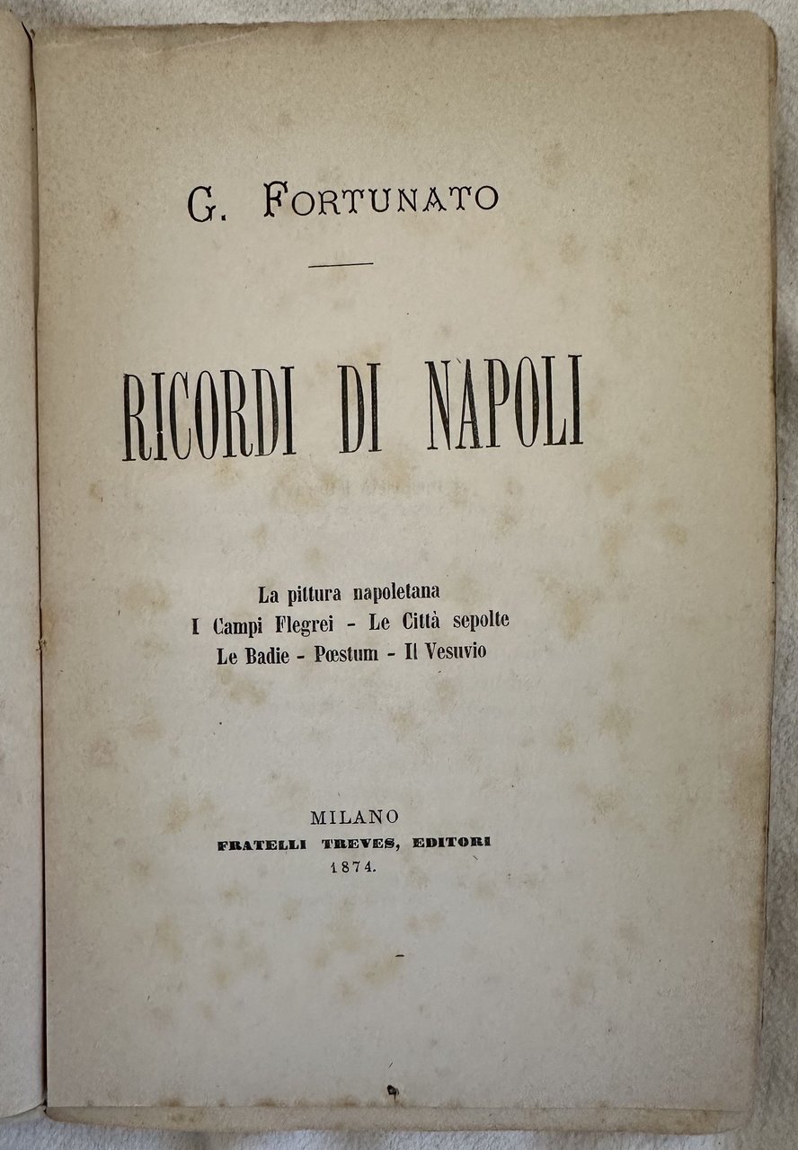 Rara opera del 1874 di questa opera su Napoli scritto da Giustino Fortunato (Rionero in Vulture 1848-Napoli 1932) politico e storico italiano, fra i più importanti rappresentanti del Meridionalismo. All'interno: la pittura napoletana, I Campi Flegrei, Le città sepolte, Le Baide, Poestum, Il Vesuvio. In buone condizioni. Copertina editoriale in buone condizioni generali. Legatura in buone condizioni. All'interno le pagine si presentano in buone condizioni con rare fioriture. In 8. Dim. 19,5x13 cm. Pp. 145+(3). Scarce work of 1874 of this work anout Naples written by Giustino Fortunato (Rionero in Vulture 1848-Napoli 1932) italian politican and hystorian, one of the most important represantives of meridionalism Meridionalismo. Inside: neapolitan paintings, I Campi Flegrei, Le città sepolte, Le Baide, Poestum, Il Vesuvio. In good conditions. Editorial cover in good conditions. Binding in good conditions. Pages in good conditions with occasional foxing. In 8. Dim. 19,5x13 cm. Pp. 145+(3).
