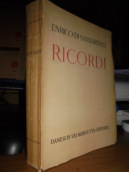 Enrico Sanmartino. RICORDI. Roma, Danesi in via Margutta - Editore, 1943. In-8°, cart. edit. con ritratto dell' Autore protetto da velina. xii, 319 pp. Ben conservato. Neg. Bol. mob. S. carc.