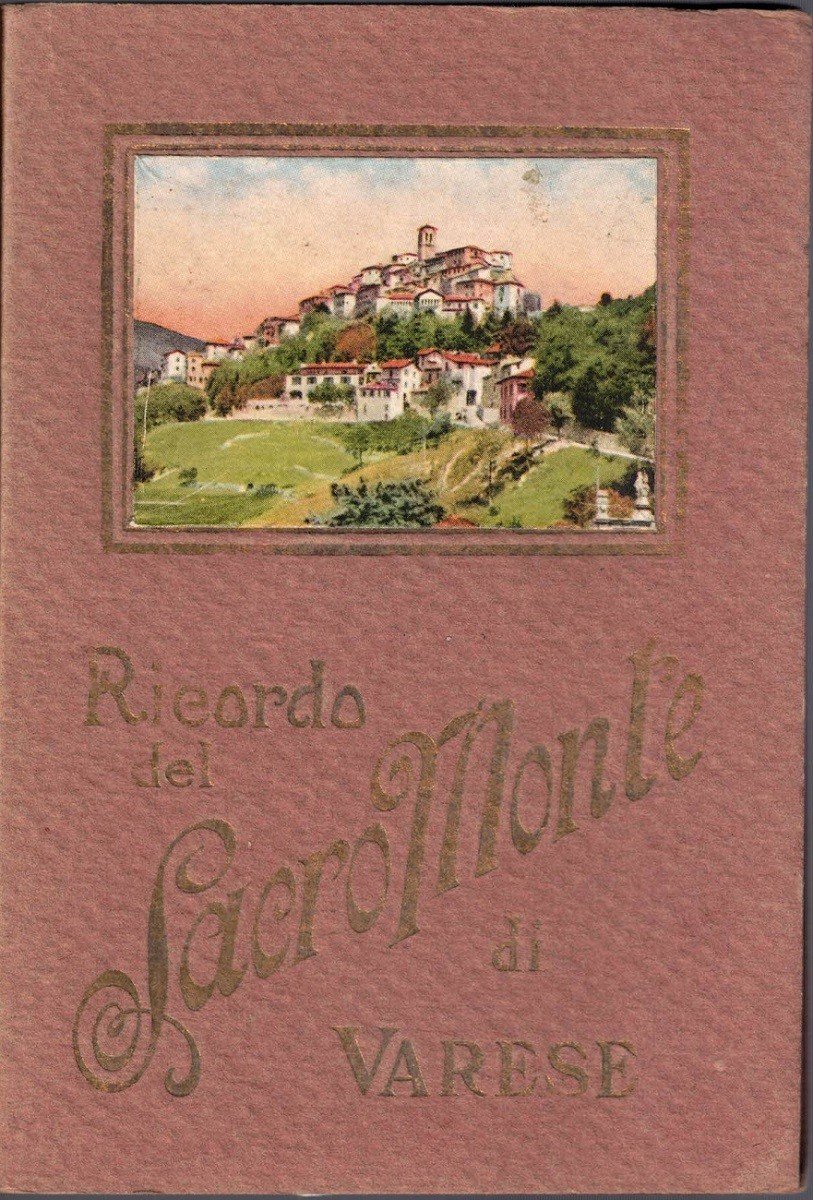 Ricordo del Sacro Monte di Varese, Ediz. G. Cairoli, Varese s.d. (ma primi ‘900), paginazione varia (per un totale di 15 c. di tavv. non numerate ill. col. con apertura a fisarmonica), interamente ill. col., cm 15, br. ed. in cartoncino con titoli e ill. col. al piatto. Pubblicazione a fisarmonica contenente 29 vedute a colori del Sacro Monte di Varese con didascalie in italiano sul retro di ciascuna tavola. Ottimo esemplare.
