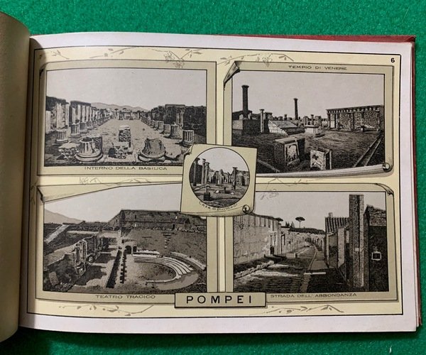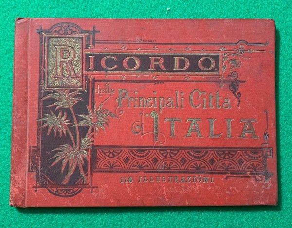 In oblungo; (1), 25 cc. Legatura editoriale rossa con titolo e cornice liberty in oro e nero. Rara raccolta di veduta di questo libretto ricordo di 116 monumenti italiani. Le vedute riguardano Roma, Napoli, Pompei, Milano, Torino, Genova, Venezia, Firenze, Pisa, Bologna, Palermo, Parma, Pegli, Sestri Ponente, Savona, Oneglia, Bordighera, Porto Maurizio, Ventimiglia, Sanremo, Como, Bellagio, Bellano, Torno, Arona, Intra, Pallanza, Isola Bella. Prima edizione di questa raccolta di vedute italiane.