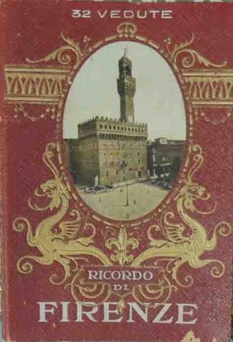 Ricordo di Firenze. 32 vedute, s.n., s.l., s.d. (19.), paginazione varia (per un totale di 32 pagine non numerate ill. b.n. che si aprono a fisarmonica), interamente ill. b.n., cm 17, bella legatura in cart. ed. con titoli, fregi dorati in rilievo e illustrazione ovale applicata al piatto. Pubblicazione contenente una serie di vedute b.n. formato cartolina della città di Firenze con sul retro didascalie in italiano, inglese, francese, tedesco e ai piatti interni cartina della città a colori. Leggere tracce d’uso con minime abrasioni alla legatura, per il resto buona copia.