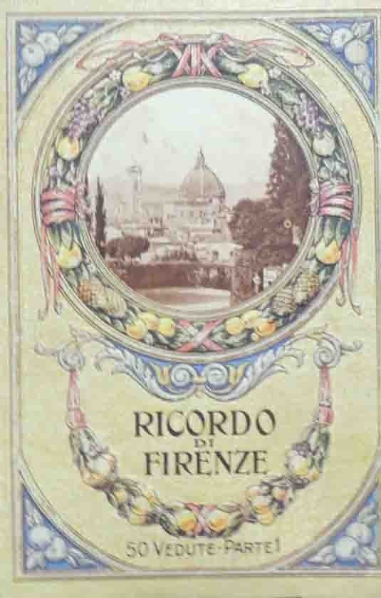 Ricordo di Firenze. 50 vedute Parte 1. Bella pubblicazione a fisarmonica con ill. b. n. su carta lucida e pianta topografica b. n. all’interno della copertina, s. n., s. l. s. d. (ma primi ‘900), cm 17, cart. ed. con eleganti decorazioni in rilievo di gusto liberty e foto in seppia. Lievi tracce d’uso ai piatti, uno strappetto senza mancanze alla congiunzione di due tavole, per il resto buona copia. Raro.