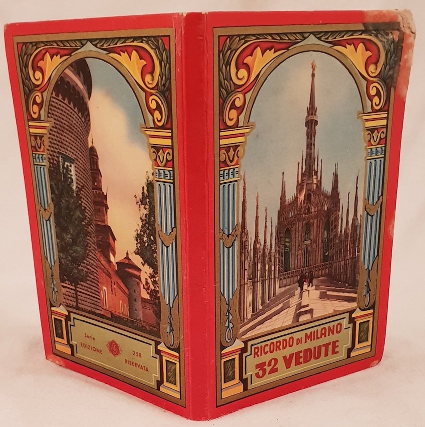 In 16. Dim. 17x12 cm. Grazioso Ricordo di Milano, una raccolta di 32 foto dei primi degli anni '30.<BR>Alcune foto sono animate con persone e carrozze, tutte mostrano monumenti, piazze e chiese di Milano.<BR>Al verso delle foto la descrizione del munumento.<BR>Mappa di Milano ai contropiatti.<BR>Bella brossura editoriale illustrata. <BR>Brossura editoriale illustrata in buone condizioni generali con lievi usure ai margini e dorso. Legatura in buone condizioni. All'interno le pagine si presentano in discrete condizioni con rare fioriture. Segno di umidità all'angolo superiore destro con parti mancanti. Interesting Remembering of Milan, a collection of 32 photoes of 1930's.<BR>Some photoes are animated with people and coaches, all represent monuments, squares and churches of Rome.<BR>In the back of the photo the description of the monument.<BR>Map of Milan in the internal part of plates.<BR>Beautiful editorial illustrated cover. <BR>Editorial illustrated cover in good general conditions slightly worn in the edges and spine. Binding in good conditions. Inside pages are in fair conditions with occasional foxings. Water stains in the upper right corner with missing parts.