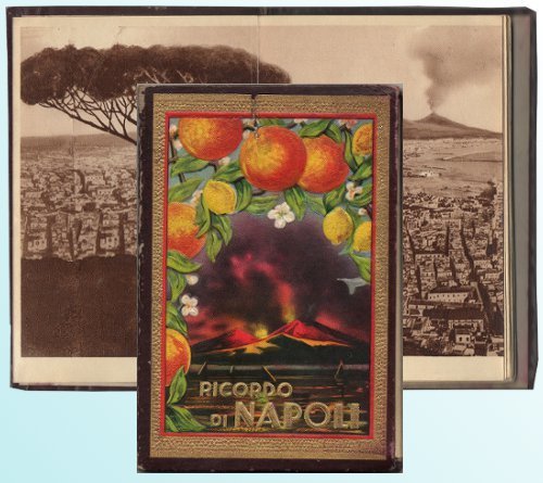 In 16mo (cm 17x11,5) cartonato con figure in rilievo a colori (cromolitografia) . Album composto da 19 cartoline fotografiche tinta seppia fra cui una grande veduta panoramica della città (cm 55x16). Didascalie al retro.