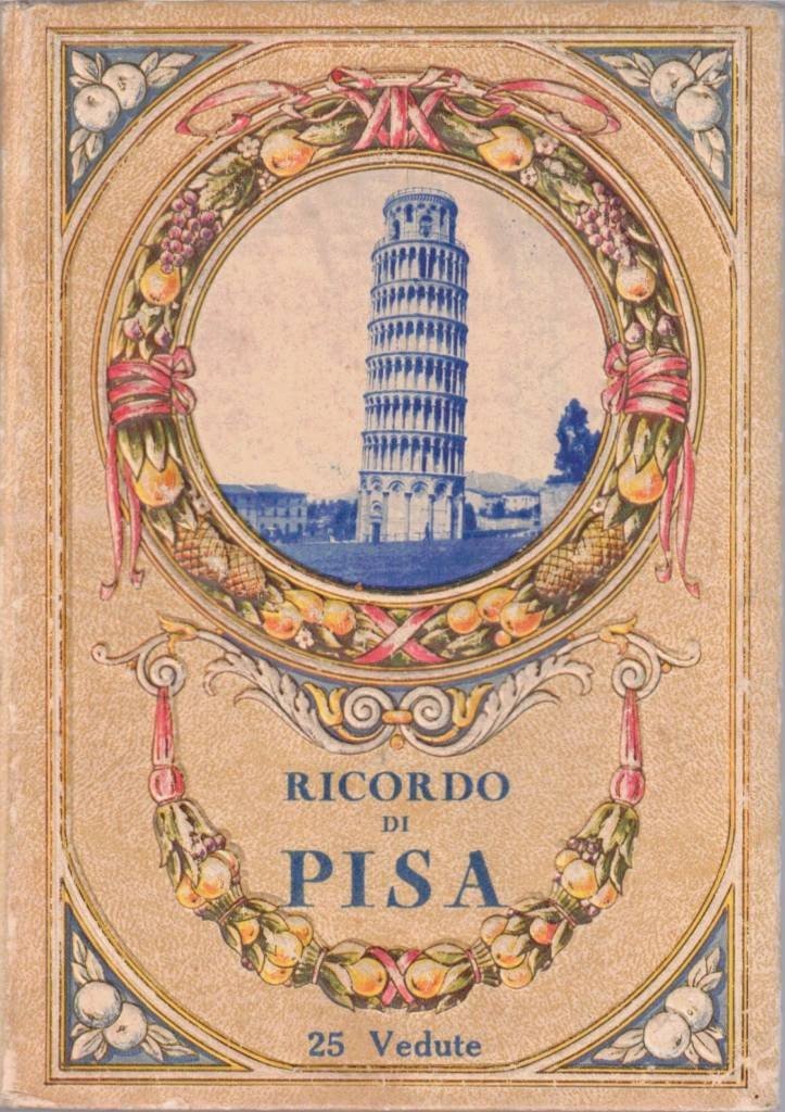 Ricordo di Pisa. 25 vedute. Bella pubblicazione a fisarmonica con ill. b. n. su carta lucida, s. n., s. l. s. d. (ma primi ‘900), cm 17, cart. ed. con eleganti decorazioni in rilievo di gusto liberty e medaglione con foto. Lievi tracce d’uso ai piatti, uno strappetto senza mancanze alla congiunzione di due tavole, per il resto buona copia. Molto raro.