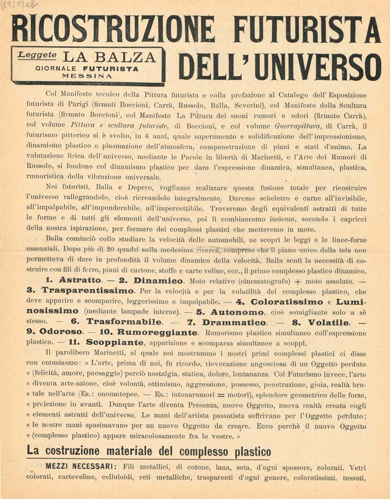 MANIFESTOEdizione originale.Ottimo esemplare.Uno dei più creativi manifesti del periodo del primo futurismo, pubblicato proprio a ridosso dell’entrata dell’Italia nella guerra europea. Contiene sei fotografie in bianco e nero dei «complessi plastici» inventati da Giacomo Balla e dal suo giovanissimo allievo, Fortunato Depero. Il manifesto ha inoltre il merito di aver inventato un titolo destinato a diventare memorabile contrassegno dalla specificità del futurismo tra le avanguardie storiche (ancora nel 2014 la grande mostra al Guggenheim di New York sottotitola «Reconstructing the universe»).Bibl.: Tonini, I manifesti del futurismo italiano, 89.1