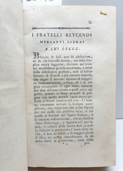 Riflessioni del signor Nicole sopra i principali punti della religione e de' costumi edizione prima italiana divisa in due parti parte prima Torino 1769 presso i fratelli Reycends