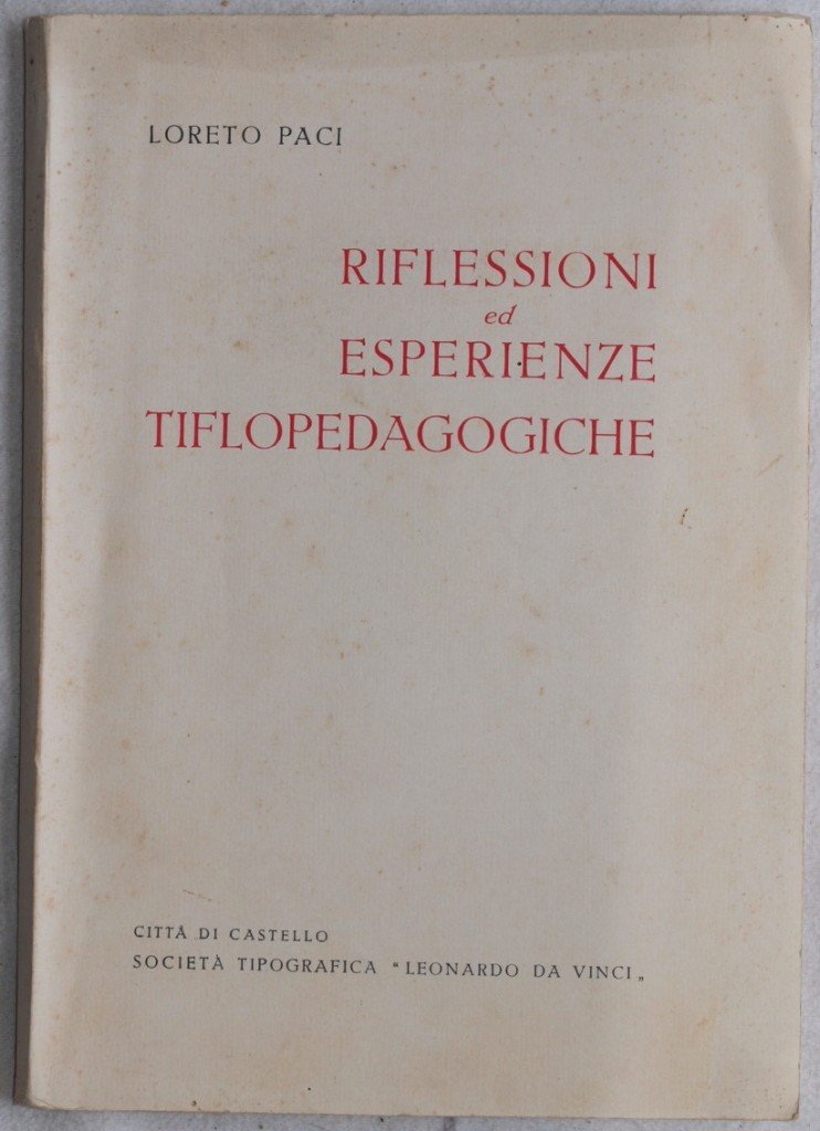 In 8. Dim. 24,5x17 cm. Pp. 86+(2). Interessante studio del 1951 di Loreto Paci, una serie di riflessioni ed esperienze sui bambini non vedenti o ipovedenti. Tra gli argomenti trattati: preconcetti sulla cecità, educazione dei ciechi deficienti, teoria dei compensi sensoriali, il senso degli ostacoli, immagini spaziali nei ciechi, come vedono i ciechi, la vita morale e il carattere dei ciechi ecc. Alla fine appendice XXIX anniversario della fondazione dell'Unione Italiana Ciechi. In buone condizioni. Copertina editoriale in buone condizioni generali con lievi usure ai margini e dorso. Legatura in ottime condizioni. All'interno le pagine si presentano in ottime condizioni con rare fioriture. Interesting study of 1951 by Loreto Paci, a series of reflexions and experiences about blind or almost blind children. Between the isseus treated: blindness, education of blind idiot people, theory of sensorial complex, sense of obstacles, spatial images in blind people, how do the blind people see, moral life and carachter of blind people ecc. At the end appendix of the XXIX anniversary of the establishment of the Unione Italiana Ciechi. In good conditions. Editorial cover in good general conditions slightly worn in the edges and spine. Binding in very good conditions. Inside pages are in very good conditions with occasional foxings.